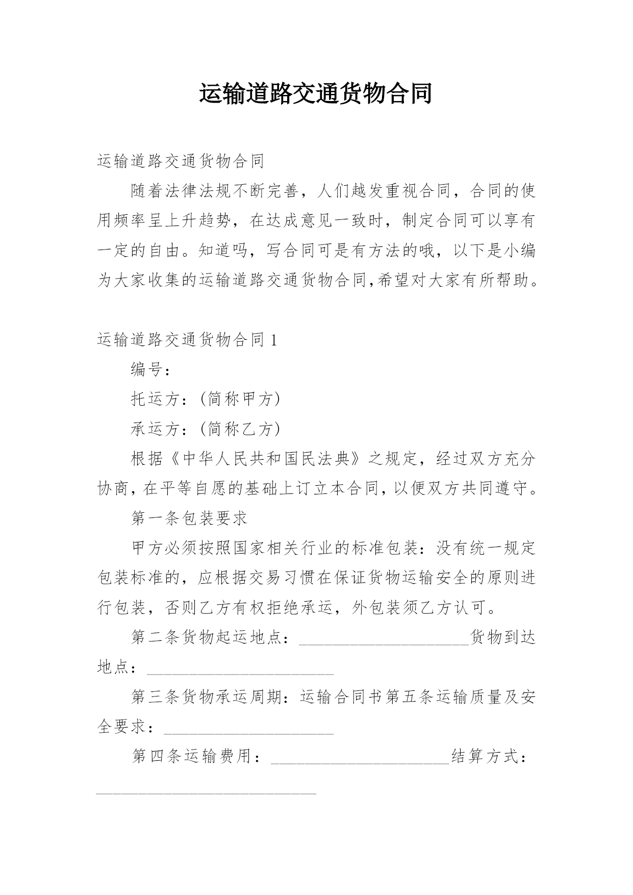 运输道路交通货物合同运输道路交通货物合同随着法律法规不断完善,人们越发重视合同,合同的使用频率呈上升趋势,在达成意见一致时,制定合同可以享有一定的自由。知道吗,写合同可是有方法的哦,以下是小编为大家收集的运输道路交通货物合同,希望对大家有所帮助。运输道路交通货物合同1编号:托运方:(简称甲方)承运方:(简称乙方)根据《中华人民共和国民法典》之规定,经过双方充分协商,在平等自愿的基础上订立本合同,以便双方共同遵守。第一条包装要求甲方必须按照国家相关行业的标准包装:没有统一规定包装标准的,应根据交易习惯在保证
