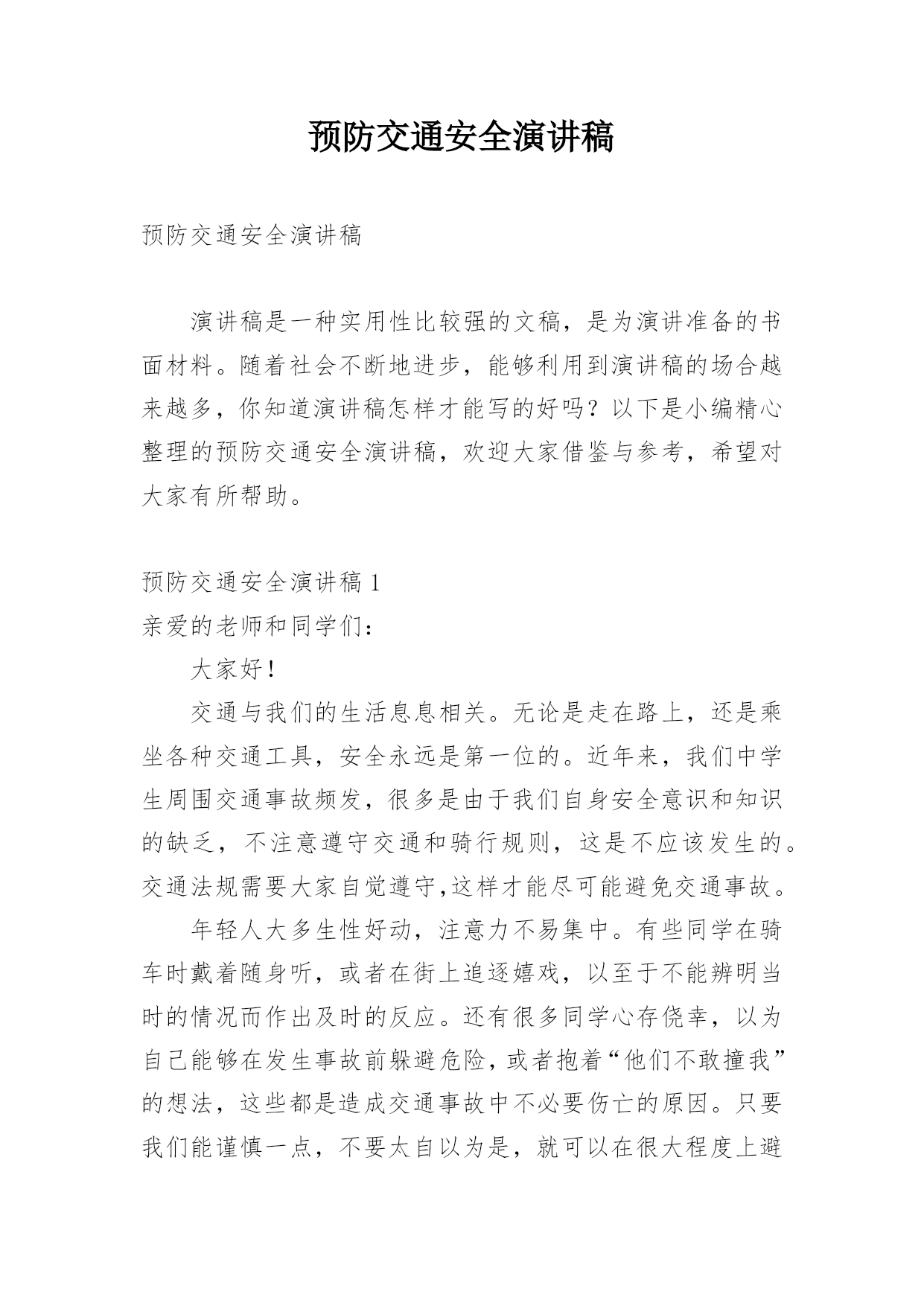 预防交通安全演讲稿预防交通安全演讲稿演讲稿是一种实用性比较强的文稿,是为演讲准备的书面材料。随着社会不断地进步,能够利用到演讲稿的场合越来越多,你知道演讲稿怎样才能写的好吗?以下是小编精心整理的预防交通安全演讲稿,欢迎大家借鉴与参考,希望对大家有所帮助。预防交通安全演讲稿1亲爱的老师和同学们:大家好!交通与我们的生活息息相关。无论是走在路上,还是乘坐各种交通工具,安全永远是第一位的。近年来,我们中学生周围交通事故频发,很多是由于我们自身安全意识和知识的缺乏,不注意遵守交通和骑行规则,这是不应该发生的。交通