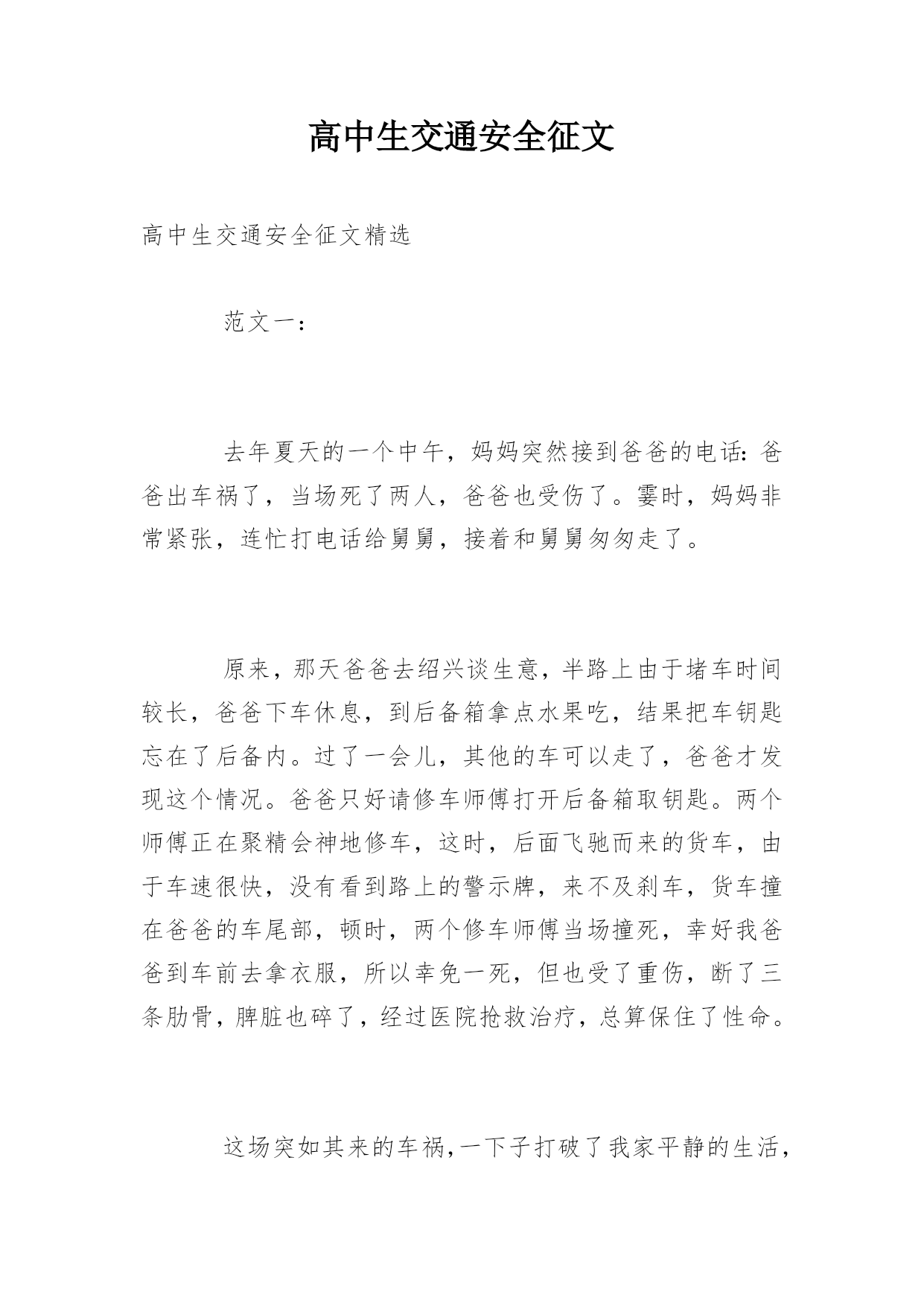 高中生交通安全征文高中生交通安全征文精选范文一:去年夏天的一个中午,妈妈突然接到爸爸的电话:爸爸出车祸了,当场死了两人,爸爸也受伤了。霎时,妈妈非常紧张,连忙打电话给舅舅,接着和舅舅匆匆走了。原来,那天爸爸去绍兴谈生意,半路上由于堵车时间较长,爸爸下车休息,到后备箱拿点水果吃,结果把车钥匙忘在了后备内。过了一会儿,其他的车可以走了,爸爸才发现这个情况。爸爸只好请修车师傅打开后备箱取钥匙。两个师傅正在聚精会神地修车,这时,后面飞驰而来的货车,由于车速很快,没有看到路上的警示牌,来不及刹车,货车撞在爸爸的车尾