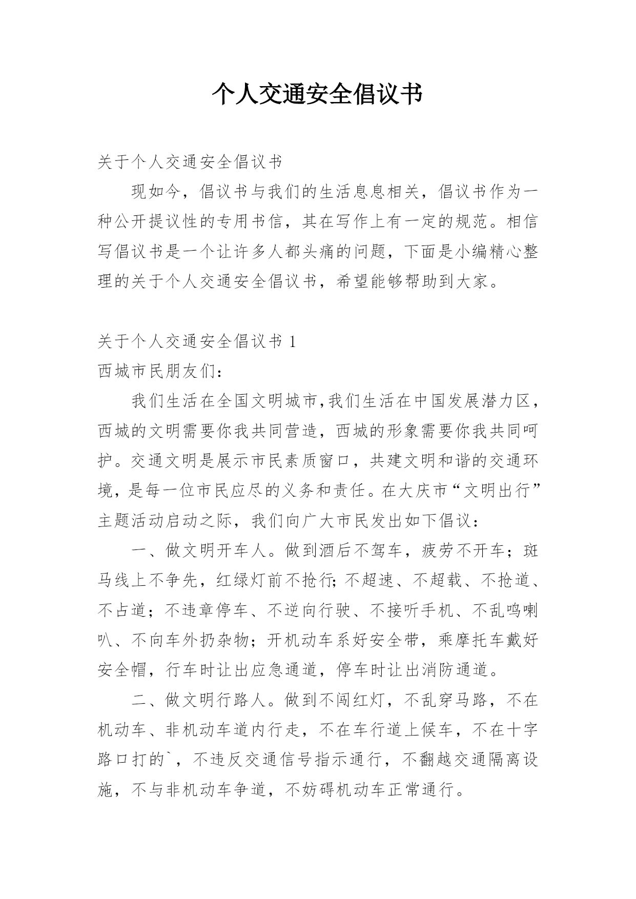 个人交通安全倡议书关于个人交通安全倡议书现如今,倡议书与我们的生活息息相关,倡议书作为一种公开提议性的专用书信,其在写作上有一定的规范。相信写倡议书是一个让许多人都头痛的问题,下面是小编精心整理的关于个人交通安全倡议书,希望能够帮助到大家。关于个人交通安全倡议书1西城市民朋友们:我们生活在全国文明城市,我们生活在中国发展潜力区,西城的文明需要你我共同营造,西城的形象需要你我共同呵护。交通文明是展示市民素质窗口,共建文明和谐的交通环境,是每一位市民应尽的义务和责任。在大庆市“文明出行”主题活动启动之际,我们