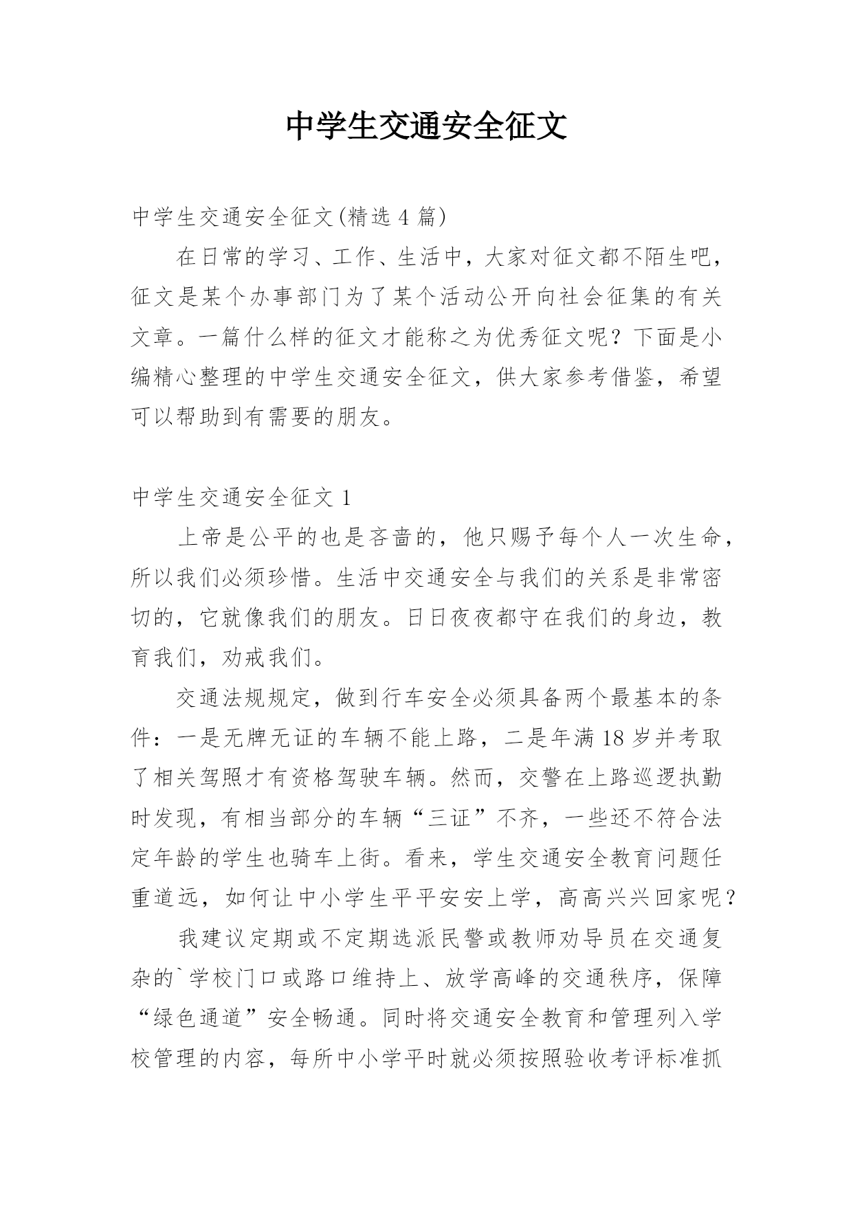 中学生交通安全征文中学生交通安全征文(精选4篇)在日常的学习、工作、生活中,大家对征文都不陌生吧,征文是某个办事部门为了某个活动公开向社会征集的有关文章。一篇什么样的征文才能称之为优秀征文呢?下面是小编精心整理的中学生交通安全征文,供大家参考借鉴,希望可以帮助到有需要的朋友。中学生交通安全征文1上帝是公平的也是吝啬的,他只赐予每个人一次生命,所以我们必须珍惜。生活中交通安全与我们的关系是非常密切的,它就像我们的朋友。日日夜夜都守在我们的身边,教育我们,劝戒我们。交通法规规定,做到行车安全必须具备两个最基本
