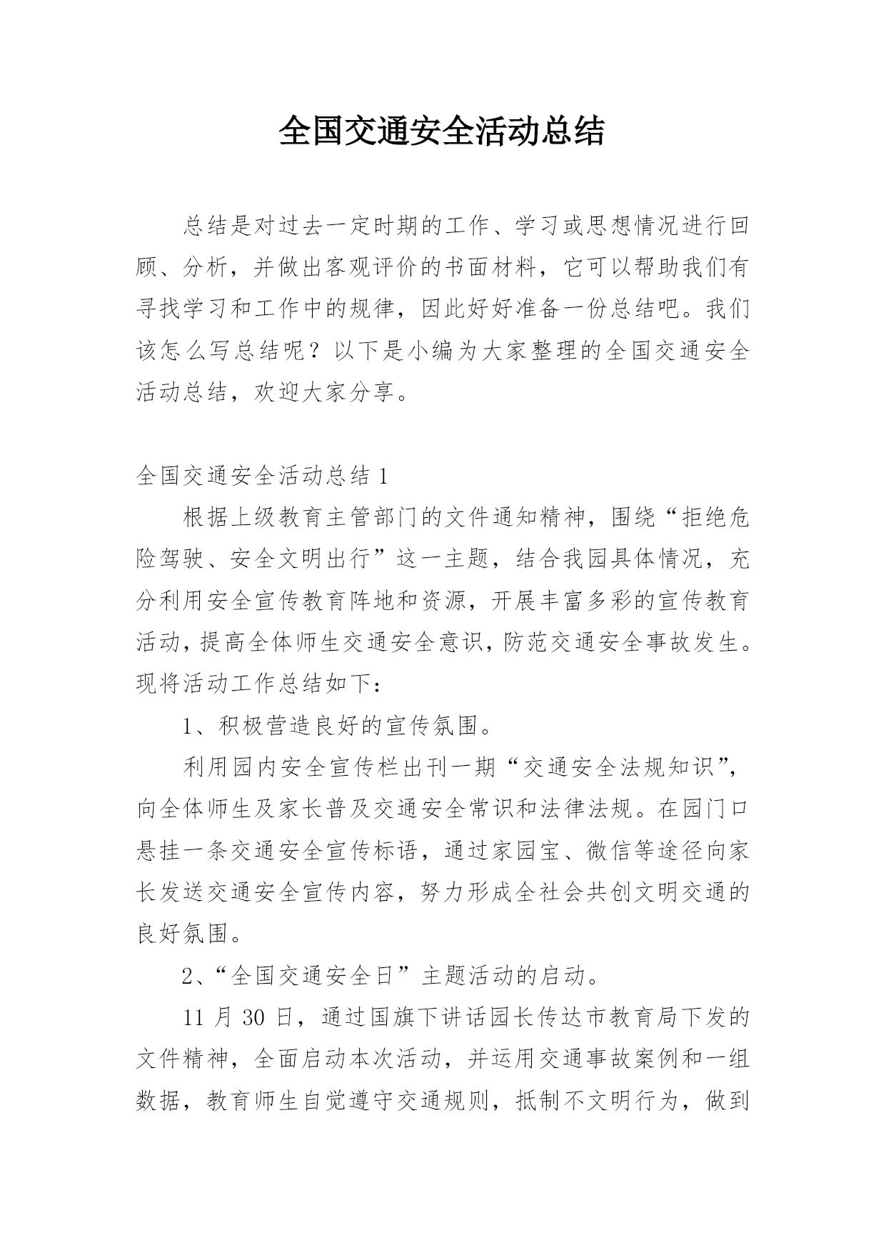 全国交通安全活动总结总结是对过去一定时期的工作、学习或思想情况进行回顾、分析,并做出客观评价的书面材料,它可以帮助我们有寻找学习和工作中的规律,因此好好准备一份总结吧。我们该怎么写总结呢?以下是小编为大家整理的全国交通安全活动总结,欢迎大家分享。全国交通安全活动总结1根据上级教育主管部门的文件通知精神,围绕“拒绝危险驾驶、安全文明出行”这一主题,结合我园具体情况,充分利用安全宣传教育阵地和资源,开展丰富多彩的宣传教育活动,提高全体师生交通安全意识,防范交通安全事故发生。现将活动工作总结如下:1、积极营造良