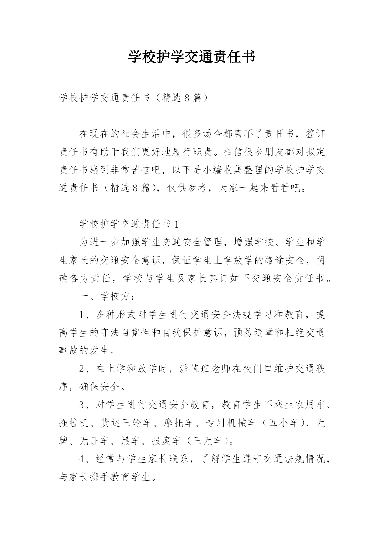 学校护学交通责任书学校护学交通责任书(精选8篇)在现在的社会生活中,很多场合都离不了责任书,签订责任书有助于我们更好地履行职责。相信很多朋友都对拟定责任书感到非常苦恼吧,以下是小编收集整理的学校护学交通责任书(精选8篇),仅供参考,大家一起来看看吧。学校护学交通责任书1为进一步加强学生交通安全管理,增强学校、学生和学生家长的交通安全意识,保证学生上学放学的路途安全,明确各方责任,学校与学生及家长签订如下交通安全责任书。一、学校方:1、多种形式对学生进行交通安全法规学习和教育,提高学生的守法自觉性和自我保护