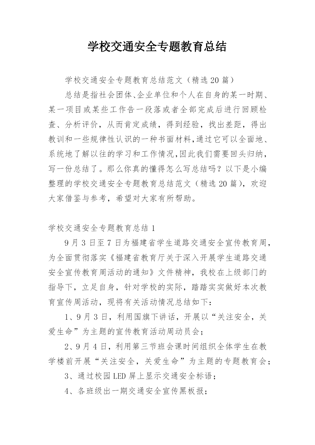 学校交通安全专题教育总结学校交通安全专题教育总结范文(精选20篇)总结是指社会团体、企业单位和个人在自身的某一时期、某一项目或某些工作告一段落或者全部完成后进行回顾检查、分析评价,从而肯定成绩,得到经验,找出差距,得出教训和一些规律性认识的一种书面材料,通过它可以全面地、系统地了解以往的学习和工作情况,因此我们需要回头归纳,写一份总结了。那么你真的懂得怎么写总结吗?以下是小编整理的学校交通安全专题教育总结范文(精选20篇),欢迎大家借鉴与参考,希望对大家有所帮助。学校交通安全专题教育总结19月3日至7日为