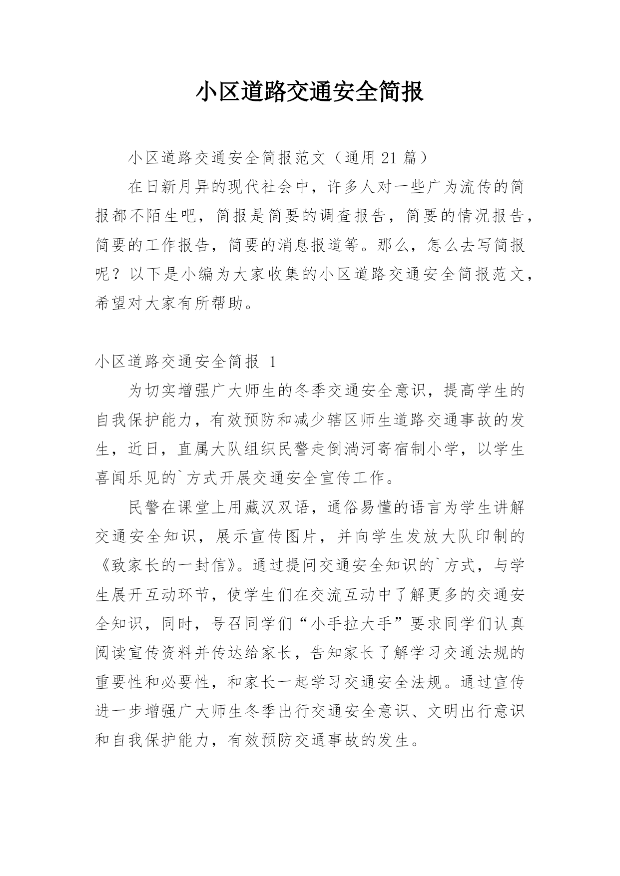 小区道路交通安全简报小区道路交通安全简报范文(通用21篇)在日新月异的现代社会中,许多人对一些广为流传的简报都不陌生吧,简报是简要的调查报告,简要的情况报告,简要的工作报告,简要的消息报道等。那么,怎么去写简报呢?以下是小编为大家收集的小区道路交通安全简报范文,希望对大家有所帮助。小区道路交通安全简报1为切实增强广大师生的冬季交通安全意识,提高学生的自我保护能力,有效预防和减少辖区师生道路交通事故的发生,近日,直属大队组织民警走倒淌河寄宿制小学,以学生喜闻乐见的`方式开展交通安全宣传工作。民警在课堂上用藏