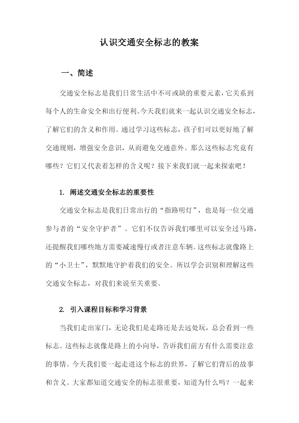 认识交通安全标志的教案一、简述交通安全标志是我们日常生活中不可或缺的重要元素,它关系到每个人的生命安全和出行便利。今天我们就来一起认识交通安全标志,了解它们的含义和作用。通过学习这些标志,孩子们可以更好地了解交通规则,增强安全意识,从而避免交通意外。那么这些标志究竟有哪些?它们又代表着怎样的含义呢?接下来我们就一起来探索吧!1.阐述交通安全标志的重要性交通安全标志是我们日常出行的“指路明灯”,也是每一位交通参与者的“安全守护者”。它们不仅告诉我们哪里可以安全过马路,还提醒我们哪些地方需要减速慢行或者注意车