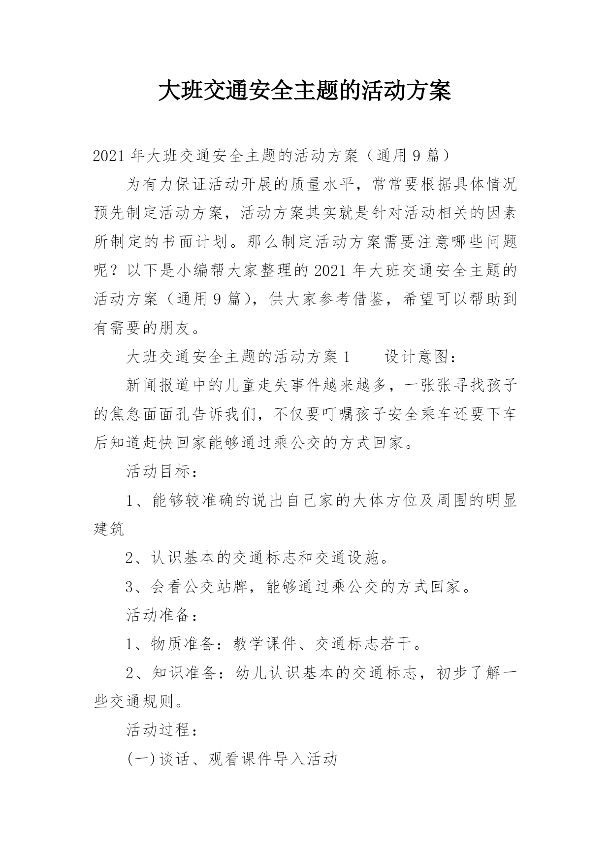 大班交通安全主题的活动方案2021年大班交通安全主题的活动方案(通用9篇)为有力保证活动开展的质量水平,常常要根据具体情况预先制定活动方案,活动方案其实就是针对活动相关的因素所制定的书面计划。那么制定活动方案需要注意哪些问题呢?以下是小编帮大家整理的2021年大班交通安全主题的活动方案(通用9篇),供大家参考借鉴,希望可以帮助到有需要的朋友。大班交通安全主题的活动方案1设计意图:新闻报道中的儿童走失事件越来越多,一张张寻找孩子的焦急面面孔告诉我们,不仅要叮嘱孩子安全乘车还要下车后知道赶快回家能够通过乘公交
