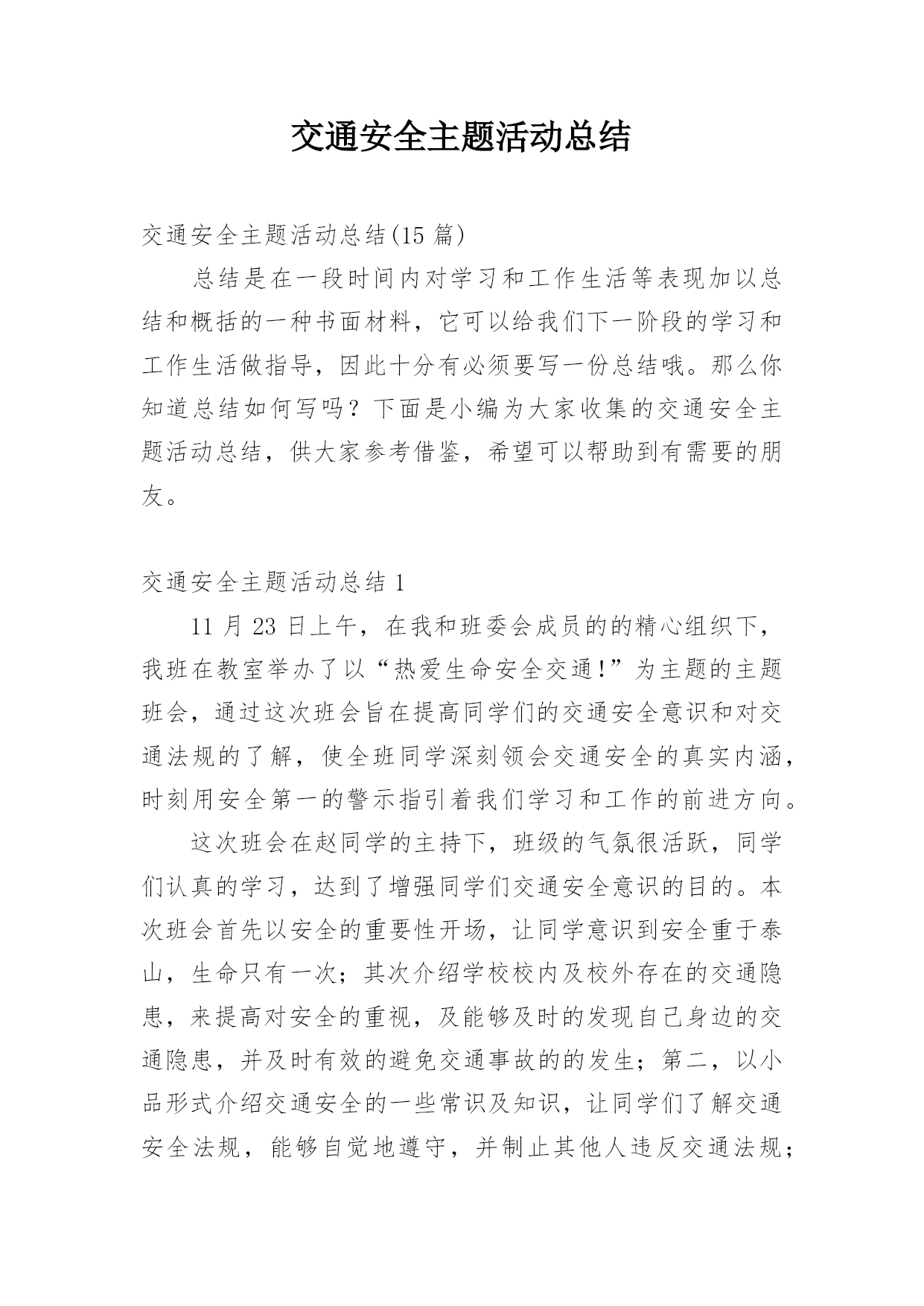 交通安全主题活动总结交通安全主题活动总结(15篇)总结是在一段时间内对学习和工作生活等表现加以总结和概括的一种书面材料,它可以给我们下一阶段的学习和工作生活做指导,因此十分有必须要写一份总结哦。那么你知道总结如何写吗?下面是小编为大家收集的交通安全主题活动总结,供大家参考借鉴,希望可以帮助到有需要的朋友。交通安全主题活动总结111月23日上午,在我和班委会成员的的精心组织下,我班在教室举办了以“热爱生命安全交通!”为主题的主题班会,通过这次班会旨在提高同学们的交通安全意识和对交通法规的了解,使全班同学深刻