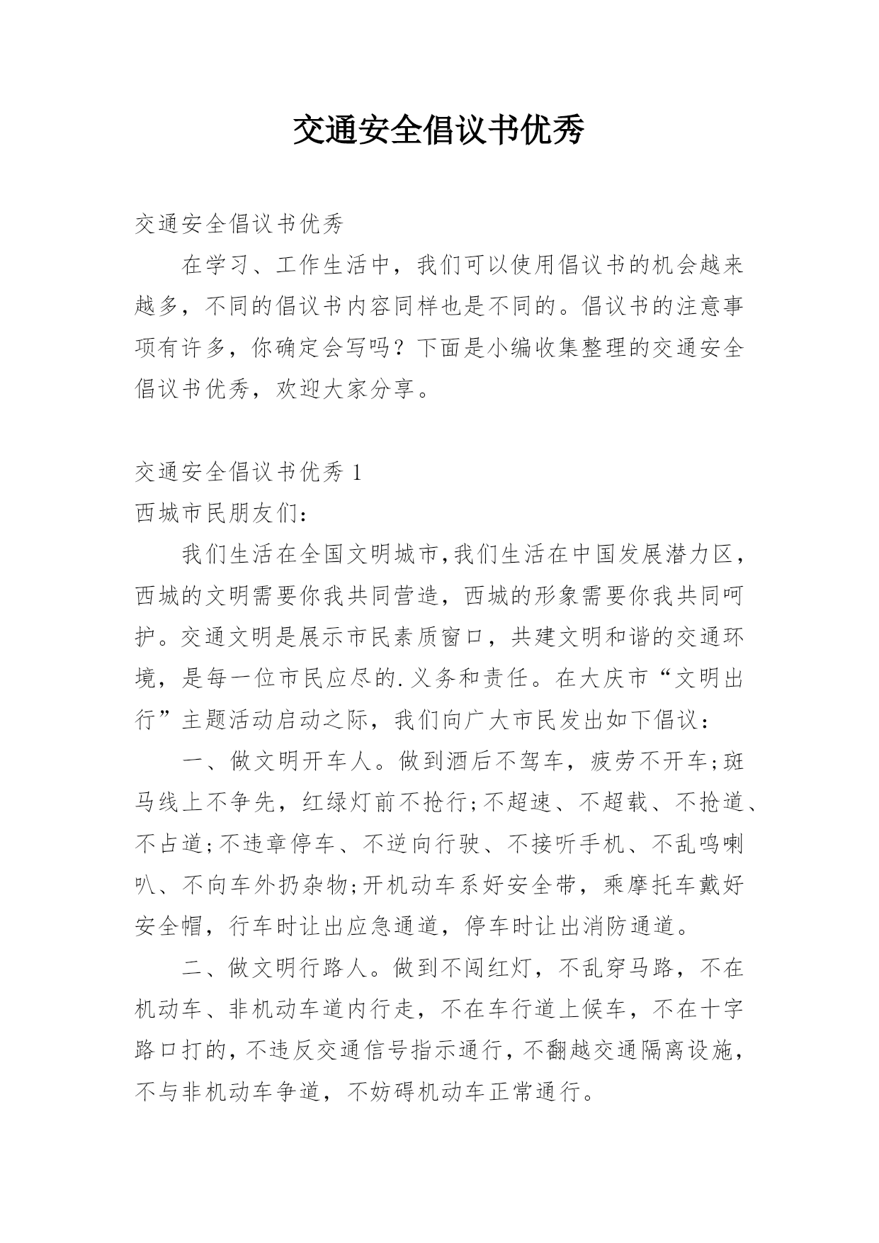 交通安全倡议书优秀交通安全倡议书优秀在学习、工作生活中,我们可以使用倡议书的机会越来越多,不同的倡议书内容同样也是不同的。倡议书的注意事项有许多,你确定会写吗?下面是小编收集整理的交通安全倡议书优秀,欢迎大家分享。交通安全倡议书优秀1西城市民朋友们:我们生活在全国文明城市,我们生活在中国发展潜力区,西城的文明需要你我共同营造,西城的形象需要你我共同呵护。交通文明是展示市民素质窗口,共建文明和谐的交通环境,是每一位市民应尽的.义务和责任。在大庆市“文明出行”主题活动启动之际,我们向广大市民发出如下倡议:一、
