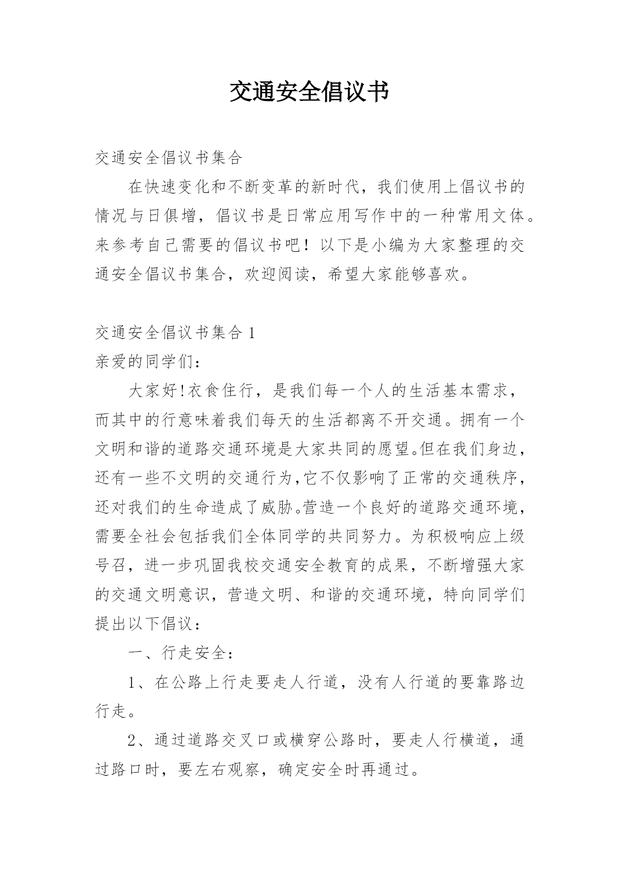 交通安全倡议书交通安全倡议书集合在快速变化和不断变革的新时代,我们使用上倡议书的情况与日俱增,倡议书是日常应用写作中的一种常用文体。来参考自己需要的倡议书吧!以下是小编为大家整理的交通安全倡议书集合,欢迎阅读,希望大家能够喜欢。交通安全倡议书集合1亲爱的同学们:大家好!衣食住行,是我们每一个人的生活基本需求,而其中的行意味着我们每天的生活都离不开交通。拥有一个文明和谐的道路交通环境是大家共同的愿望。但在我们身边,还有一些不文明的交通行为,它不仅影响了正常的交通秩序,还对我们的生命造成了威胁。营造一个良好的