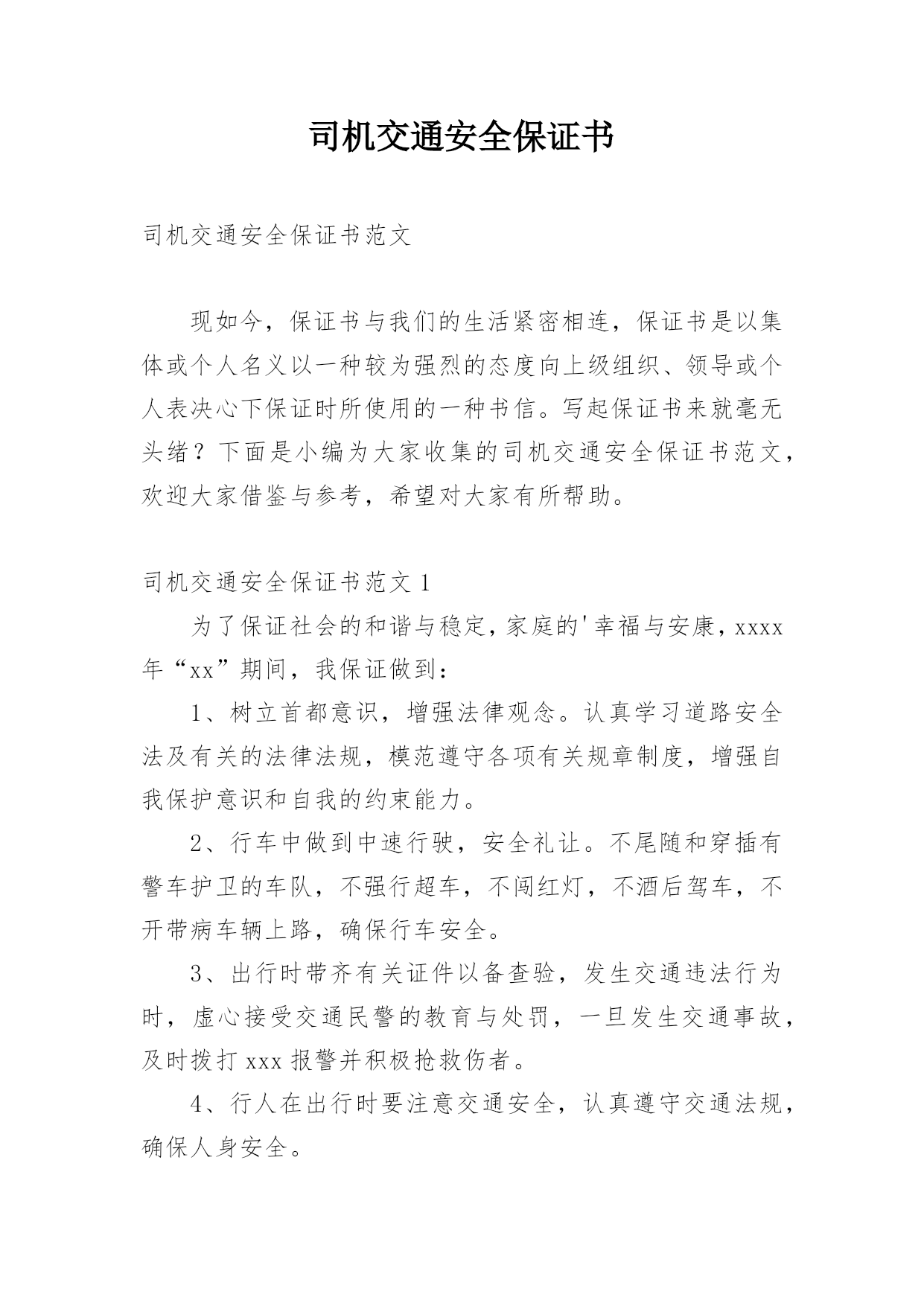 司机交通安全保证书司机交通安全保证书范文现如今,保证书与我们的生活紧密相连,保证书是以集体或个人名义以一种较为强烈的态度向上级组织、领导或个人表决心下保证时所使用的一种书信。写起保证书来就毫无头绪?下面是小编为大家收集的司机交通安全保证书范文,欢迎大家借鉴与参考,希望对大家有所帮助。司机交通安全保证书范文1为了保证社会的和谐与稳定,家庭的'幸福与安康,xxxx年“xx”期间,我保证做到:1、树立首都意识,增强法律观念。认真学习道路安全法及有关的法律法规,模范遵守各项有关规章制度,增强自我保护意识和自我的约