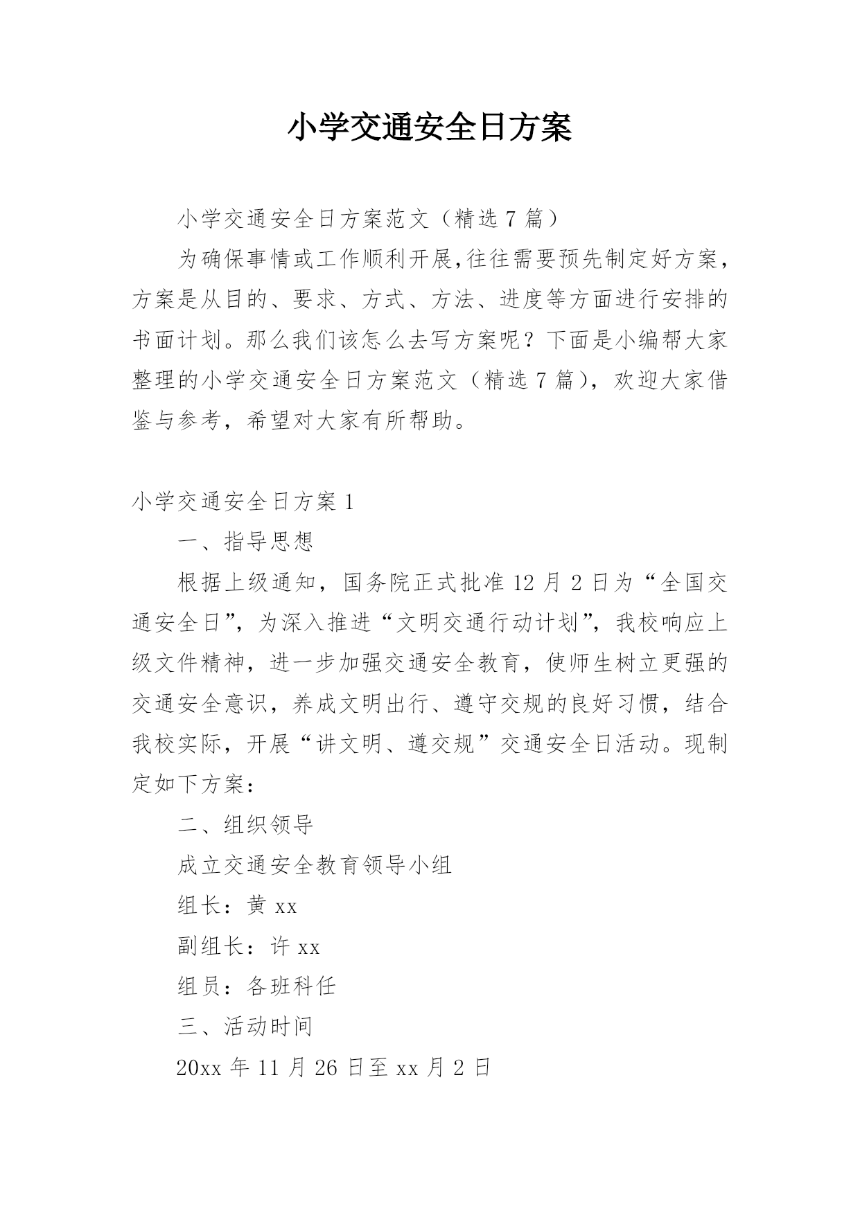 小学交通安全日方案小学交通安全日方案范文(精选7篇)为确保事情或工作顺利开展,往往需要预先制定好方案,方案是从目的、要求、方式、方法、进度等方面进行安排的书面计划。那么我们该怎么去写方案呢?下面是小编帮大家整理的小学交通安全日方案范文(精选7篇),欢迎大家借鉴与参考,希望对大家有所帮助。小学交通安全日方案1一、指导思想根据上级通知,国务院正式批准12月2日为“全国交通安全日”,为深入推进“文明交通行动计划”,我校响应上级文件精神,进一步加强交通安全教育,使师生树立更强的交通安全意识,养成文明出行、遵守交规