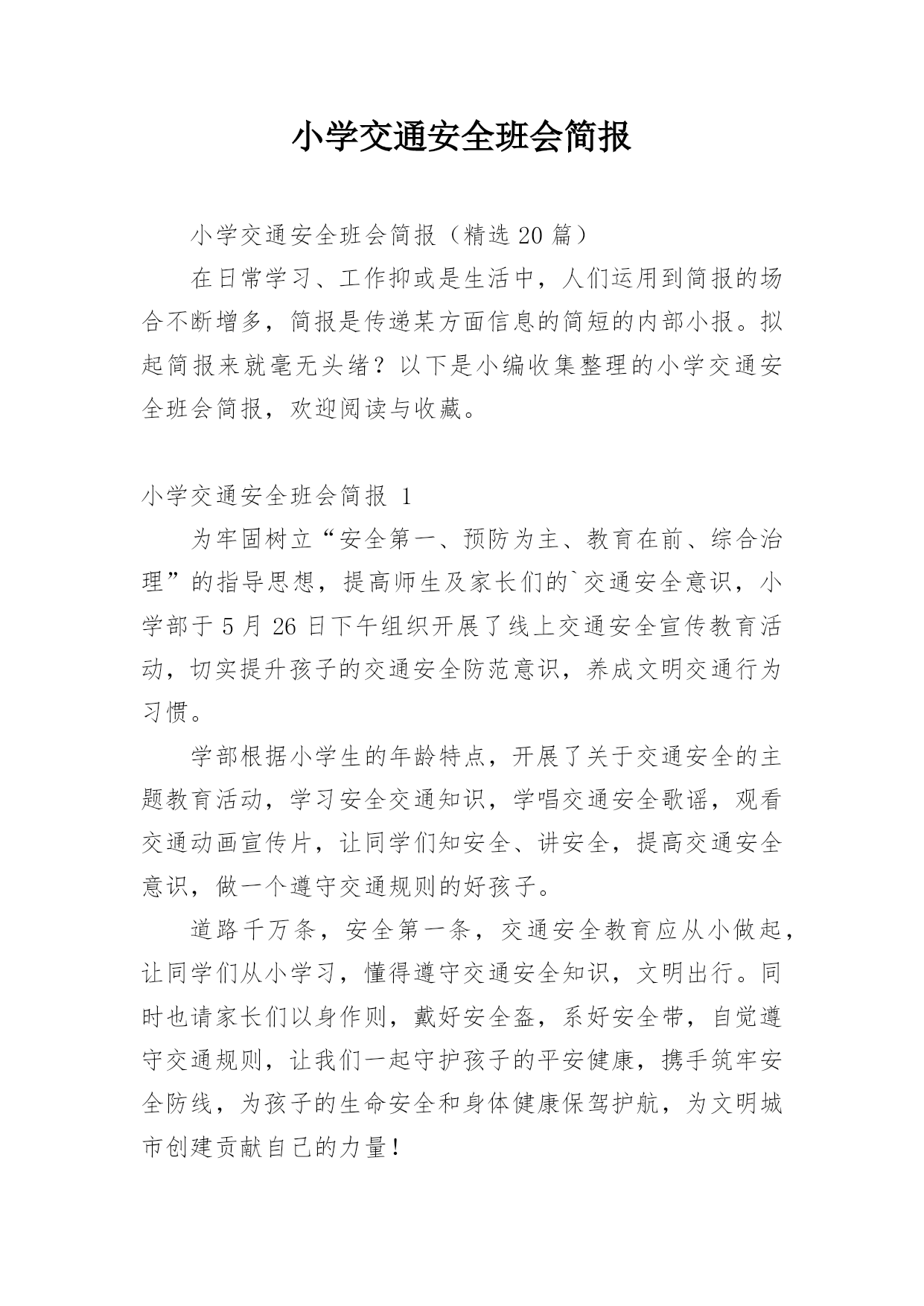 小学交通安全班会简报小学交通安全班会简报(精选20篇)在日常学习、工作抑或是生活中,人们运用到简报的场合不断增多,简报是传递某方面信息的简短的内部小报。拟起简报来就毫无头绪?以下是小编收集整理的小学交通安全班会简报,欢迎阅读与收藏。小学交通安全班会简报1为牢固树立“安全第一、预防为主、教育在前、综合治理”的指导思想,提高师生及家长们的`交通安全意识,小学部于5月26日下午组织开展了线上交通安全宣传教育活动,切实提升孩子的交通安全防范意识,养成文明交通行为习惯。学部根据小学生的年龄特点,开展了关于交通安全的
