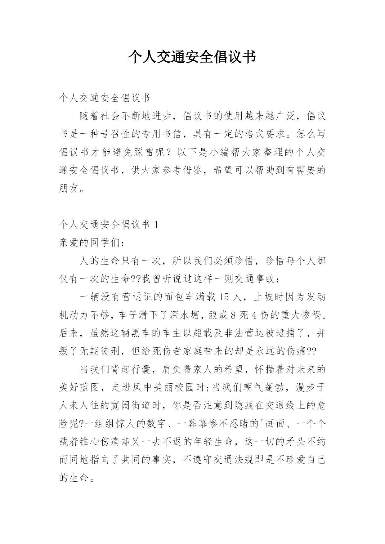 个人交通安全倡议书个人交通安全倡议书随着社会不断地进步,倡议书的使用越来越广泛,倡议书是一种号召性的专用书信,具有一定的格式要求。怎么写倡议书才能避免踩雷呢?以下是小编帮大家整理的个人交通安全倡议书,供大家参考借鉴,希望可以帮助到有需要的朋友。个人交通安全倡议书1亲爱的同学们:人的生命只有一次,所以我们必须珍惜,珍惜每个人都仅有一次的生命??我曾听说过这样一则交通事故:一辆没有营运证的面包车满载15人,上坡时因为发动机动力不够,车子滑下了深水塘,酿成8死4伤的重大惨祸。后来,虽然这辆黑车的车主以超载及非法