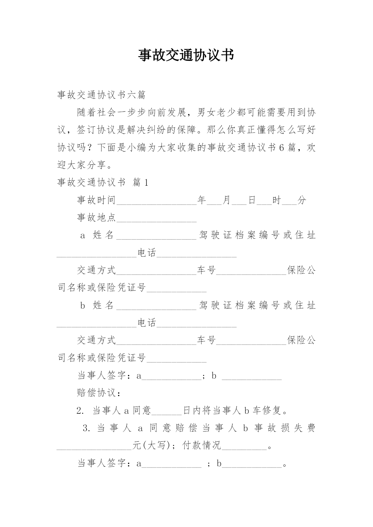 事故交通协议书事故交通协议书六篇随着社会一步步向前发展,男女老少都可能需要用到协议,签订协议是解决纠纷的保障。那么你真正懂得怎么写好协议吗?下面是小编为大家收集的事故交通协议书6篇,欢迎大家分享。事故交通协议书篇1事故时间________________年___月___日___时___分事故地点________________a姓名________________驾驶证档案编号或住址________________电话________________交通方式________________车号______