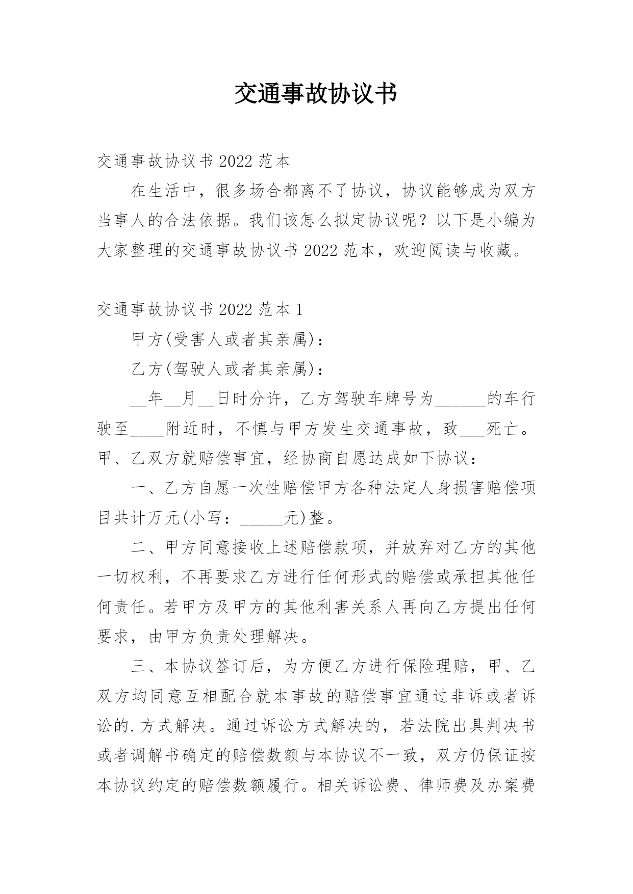 交通事故协议书交通事故协议书2022范本在生活中,很多场合都离不了协议,协议能够成为双方当事人的合法依据。我们该怎么拟定协议呢?以下是小编为大家整理的交通事故协议书2022范本,欢迎阅读与收藏。交通事故协议书2022范本1甲方(受害人或者其亲属):乙方(驾驶人或者其亲属):__年__月__日时分许,乙方驾驶车牌号为______的车行驶至____附近时,不慎与甲方发生交通事故,致___死亡。甲、乙双方就赔偿事宜,经协商自愿达成如下协议:一、乙方自愿一次性赔偿甲方各种法定人身损害赔偿项目共计万元(小写:___