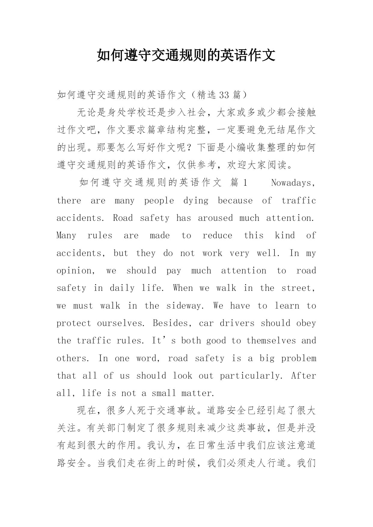 如何遵守交通规则的英语作文如何遵守交通规则的英语作文(精选33篇)无论是身处学校还是步入社会,大家或多或少都会接触过作文吧,作文要求篇章结构完整,一定要避免无结尾作文的出现。那要怎么写好作文呢?下面是小编收集整理的如何遵守交通规则的英语作文,仅供参考,欢迎大家阅读。如何遵守交通规则的英语作文篇1Nowadays,therearemanypeopledyingbecauseoftrafficaccidents.Roadsafetyhasarousedmuchattention.Manyrulesaremad