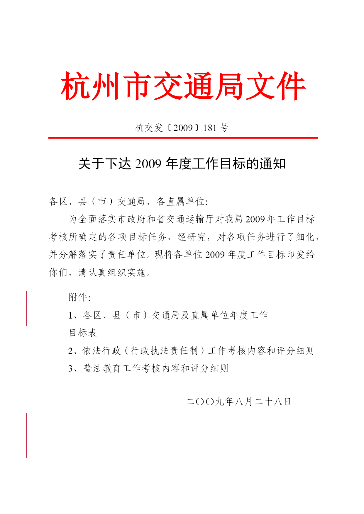 杭州市交通局文件FORMTEXT杭交发〔2009〕181号关于下达2009年度工作目标的通知各区、县(市)交通局,各直属单位:为全面落实市政府和省交通运输厅对我局2009年工作目标考核所确定的各项目标任务,经研究,对各项任务进行了细化,并分解落实了责任单位。现将各单位2009年度工作目标印发给你们,请认真组织实施。附件:1、各区、县(市)交通局及直属单位年度工作目标表2、依法行政(行政执法责任制)工作考核内容和评分细则3、普法教育工作考核内容和评分细则二〇〇九年八月二十八日主题词:工作目标考核通知抄