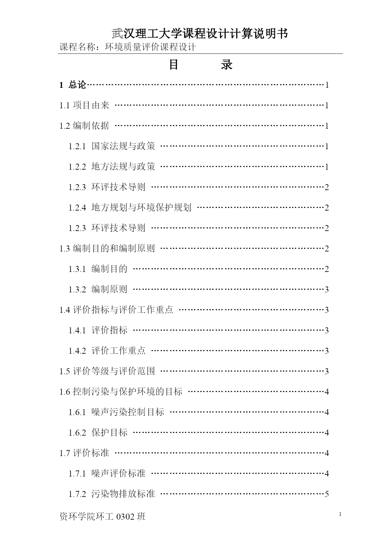 武汉理工大学课程设计计算说明书课程名称:环境质量评价课程设计PAGEPAGE3资环学院环工0302班目录1总论……………………………………………………………………11.1项目由来……………………………………………………………11.2编制依据……………………………………………………………11.2.1国家法规与政策………………………………………………11.2.2地方法规与政策………………………………………………11.2.3环评技术导则…………………………………………………21.2.4地方规划与环境