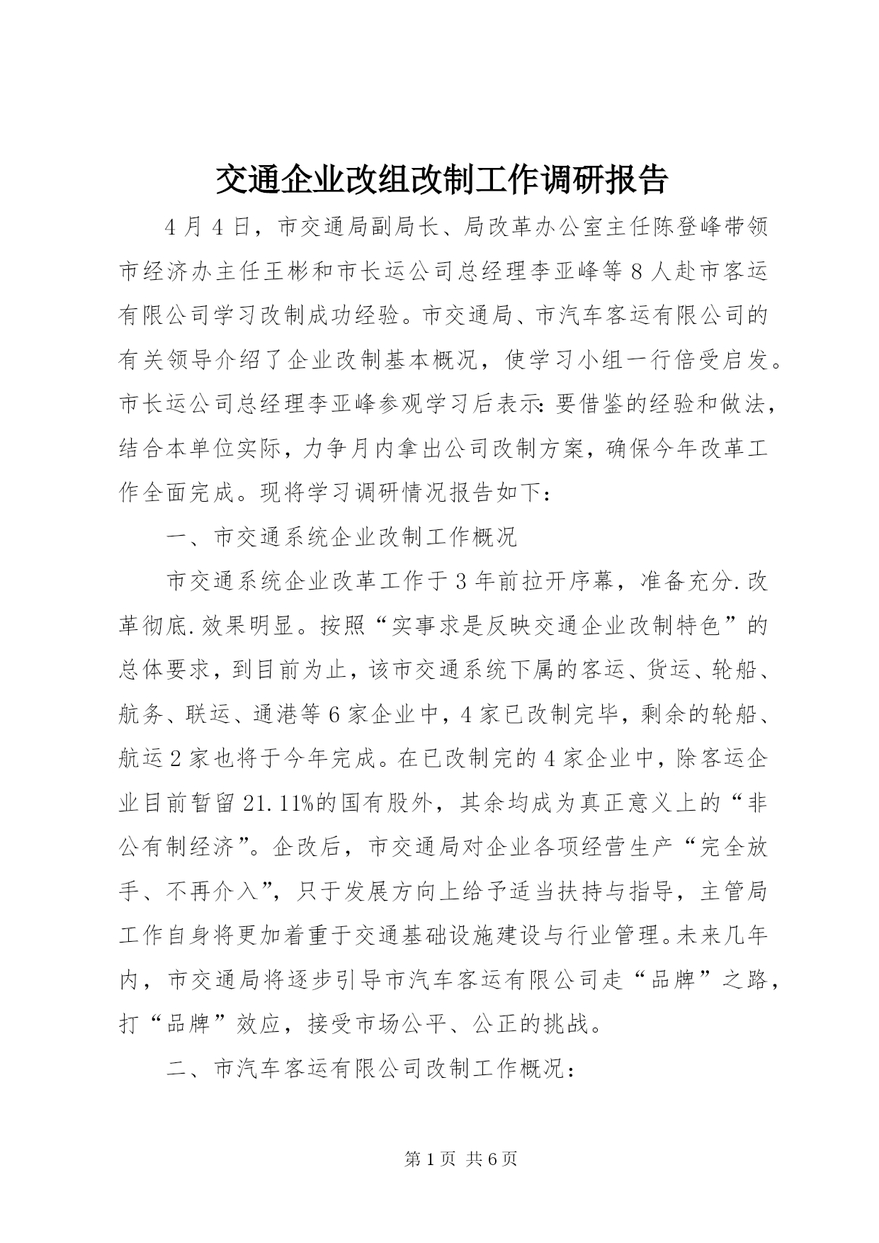 第PAGE\*Arabic\*MERGEFORMAT6页共NUMPAGES\*MERGEFORMAT6页交通企业改组改制工作调研报告4月4日,市交通局副局长、局改革办公室主任陈登峰带领市经济办主任王彬和市长运公司总经理李亚峰等8人赴市客运有限公司学习改制成功经验。市交通局、市汽车客运有限公司的有关领导介绍了企业改制基本概况,使学习小组一行倍受启发。市长运公司总经理李亚峰参观学习后表示:要借鉴的经验和做法,结合本单位实际,力争月内拿出公司改制方案,确保今年改革工作全面完成。现将学习调研情况报告如