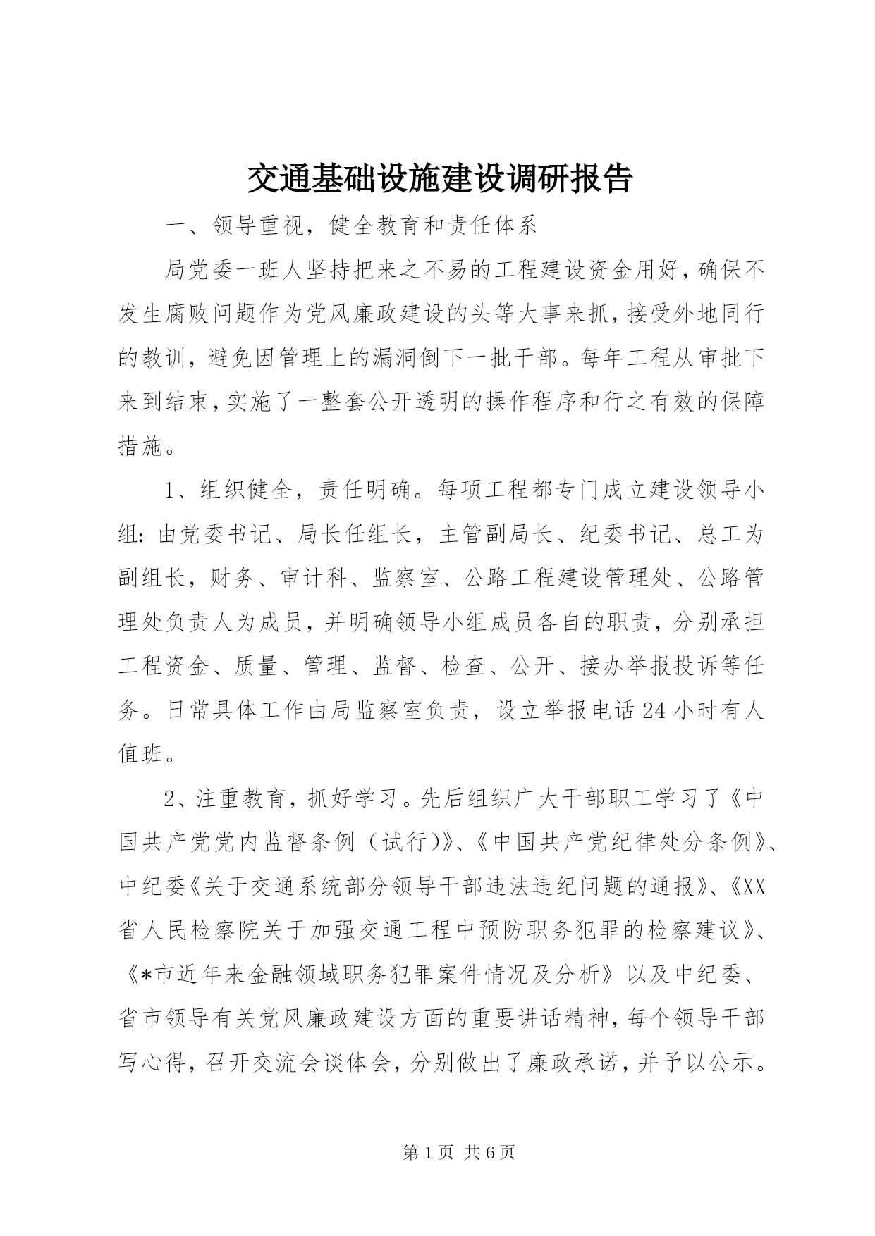 第PAGE\*Arabic\*MERGEFORMAT6页共NUMPAGES\*MERGEFORMAT6页交通基础设施建设调研报告一、领导重视,健全教育和责任体系局党委一班人坚持把来之不易的工程建设资金用好,确保不发生腐败问题作为党风廉政建设的头等大事来抓,接受外地同行的教训,避免因管理上的漏洞倒下一批干部。每年工程从审批下来到结束,实施了一整套公开透明的操作程序和行之有效的保障措施。1、组织健全,责任明确。每项工程都专门成立建设领导小组:由党委书记、局长任组长,主管副局长、纪委书记、总工为副组