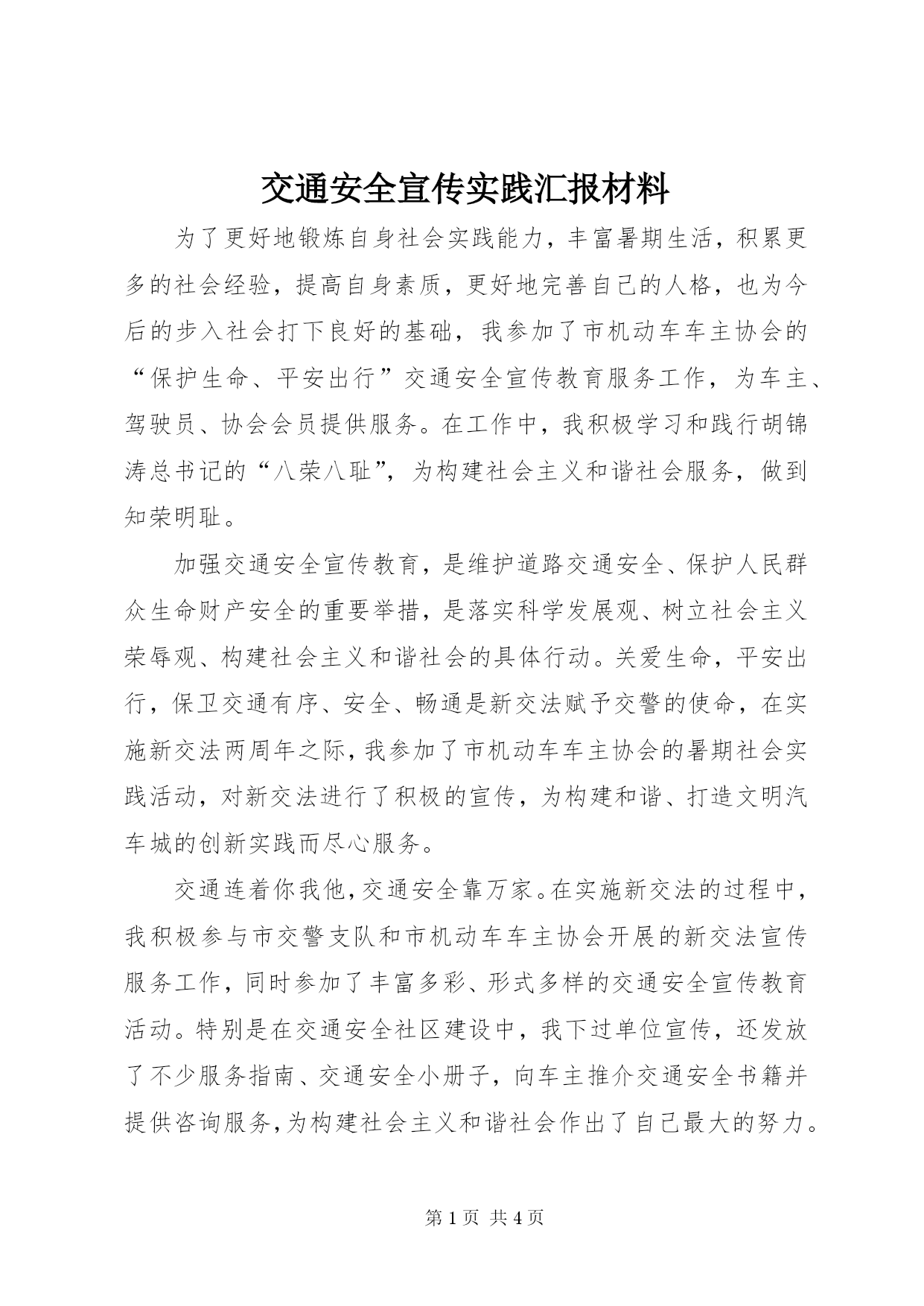 第PAGE\*Arabic\*MERGEFORMAT4页共NUMPAGES\*MERGEFORMAT4页交通安全宣传实践汇报材料为了更好地锻炼自身社会实践能力,丰富暑期生活,积累更多的社会经验,提高自身素质,更好地完善自己的人格,也为今后的步入社会打下良好的基础,我参加了市机动车车主协会的“保护生命、平安出行”交通安全宣传教育服务工作,为车主、驾驶员、协会会员提供服务。在工作中,我积极学习和践行胡锦涛总书记的“八荣八耻”,为构建社会主义和谐社会服务,做到知荣明耻。加强交通安全宣传教育,是维护道