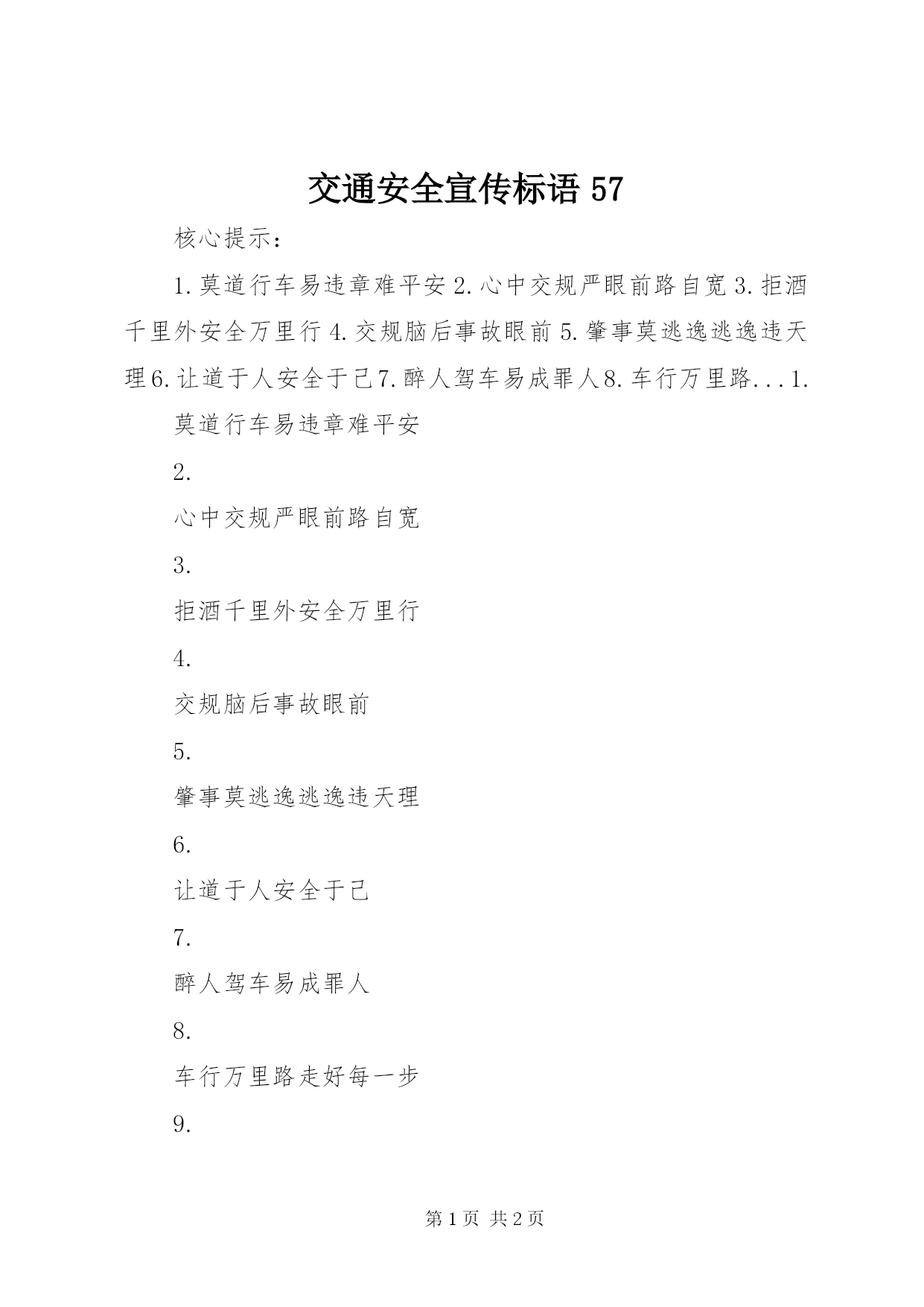 第PAGE\*Arabic\*MERGEFORMAT2页共NUMPAGES\*MERGEFORMAT2页交通安全宣传标语57核心提示:1.莫道行车易违章难平安2.心中交规严眼前路自宽3.拒酒千里外安全万里行4.交规脑后事故眼前5.肇事莫逃逸逃逸违天理6.让道于人安全于己7.醉人驾车易成罪人8.车行万里路...1.莫道行车易违章难平安2.心中交规严眼前路自宽3.拒酒千里外安全万里行4.交规脑后事故眼前5.肇事莫逃逸逃逸违天理6.让道于人安全于己7.醉人驾车易成罪人8.车行万里路走好每一步9.礼让