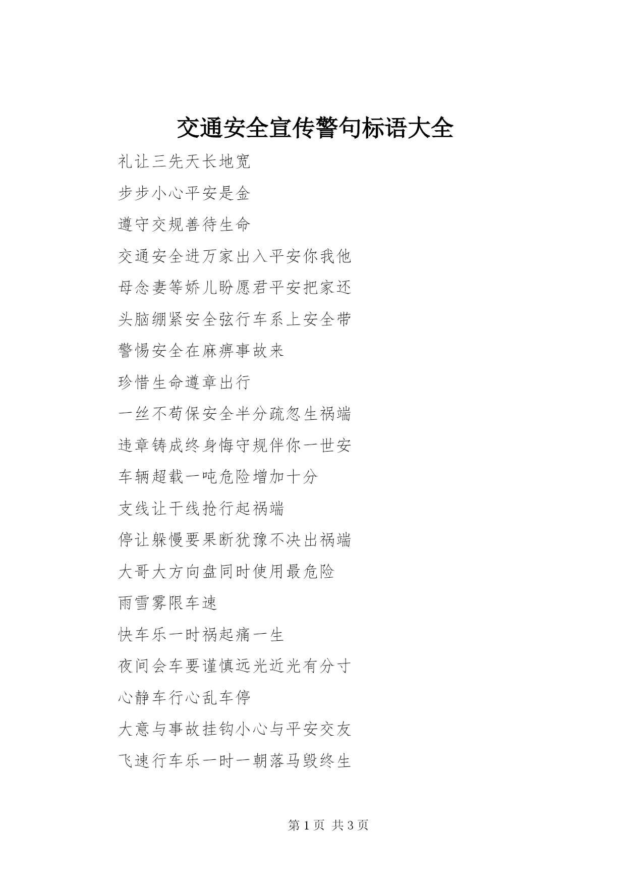 第PAGE\*Arabic\*MERGEFORMAT3页共NUMPAGES\*MERGEFORMAT3页交通安全宣传警句标语大全礼让三先天长地宽步步小心平安是金遵守交规善待生命交通安全进万家出入平安你我他母念妻等娇儿盼愿君平安把家还头脑绷紧安全弦行车系上安全带警惕安全在麻痹事故来珍惜生命遵章出行一丝不苟保安全半分疏忽生祸端违章铸成终身悔守规伴你一世安车辆超载一吨危险增加十分支线让干线抢行起祸端停让躲慢要果断犹豫不决出祸端大哥大方向盘同时使用最危险雨雪雾限车速快车乐一时祸起痛一生夜间会车要谨慎远