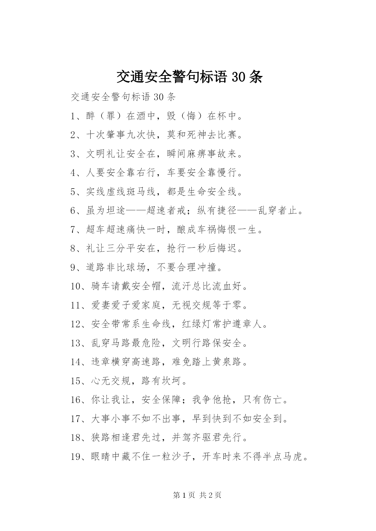 第PAGE\*Arabic\*MERGEFORMAT2页共NUMPAGES\*MERGEFORMAT2页交通安全警句标语30条交通安全警句标语30条1、醉(罪)在酒中,毁(悔)在杯中。2、十次肇事九次快,莫和死神去比赛。3、文明礼让安全在,瞬间麻痹事故来。4、人要安全靠右行,车要安全靠慢行。5、实线虚线斑马线,都是生命安全线。6、虽为坦途——超速者戒;纵有捷径——乱穿者止。7、超车超速痛快一时,酿成车祸悔恨一生。8、礼让三分平安在,抢行一秒后悔迟。9、道路非比球场,不要合理冲撞。10、骑车请戴