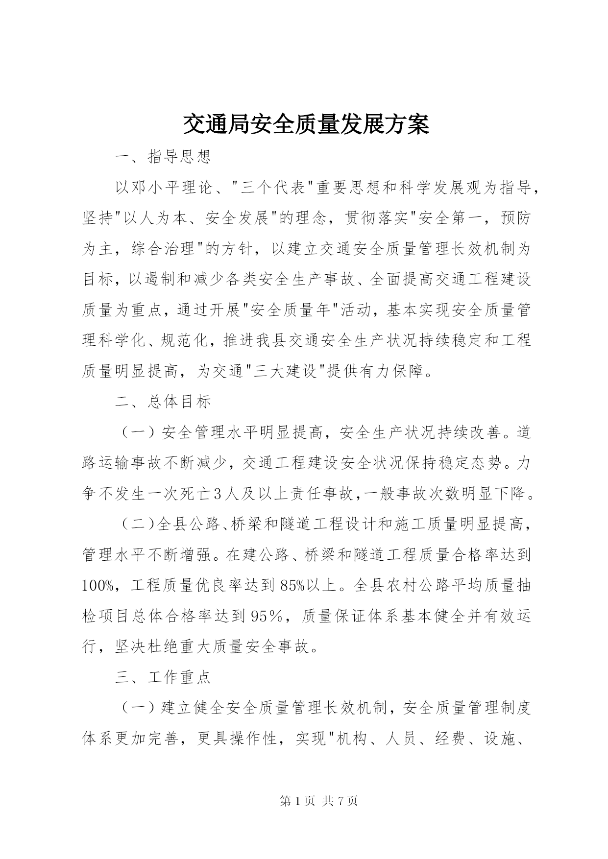 第PAGE\*Arabic\*MERGEFORMAT7页共NUMPAGES\*MERGEFORMAT7页交通局安全质量发展方案一、指导思想以邓小平理论、"三个代表"重要思想和科学发展观为指导,坚持"以人为本、安全发展"的理念,贯彻落实"安全第一,预防为主,综合治理"的方针,以建立交通安全质量管理长效机制为目标,以遏制和减少各类安全生产事故、全面提高交通工程建设质量为重点,通过开展"安全质量年"活动,基本实现安全质量管理科学化、规范化,推进我县交通安全生产状况持续稳定和工程质量明显提高,为交通"