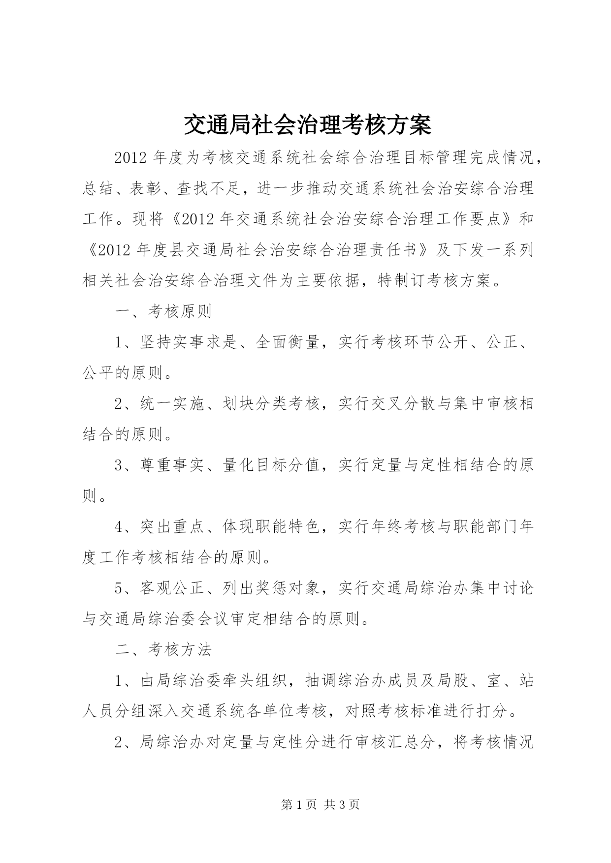 第PAGE\*Arabic\*MERGEFORMAT3页共NUMPAGES\*MERGEFORMAT3页交通局社会治理考核方案2012年度为考核交通系统社会综合治理目标管理完成情况,总结、表彰、查找不足,进一步推动交通系统社会治安综合治理工作。现将《2012年交通系统社会治安综合治理工作要点》和《2012年度县交通局社会治安综合治理责任书》及下发一系列相关社会治安综合治理文件为主要依据,特制订考核方案。一、考核原则1、坚持实事求是、全面衡量,实行考核环节公开、公正、公平的原则。2、统一实施、划