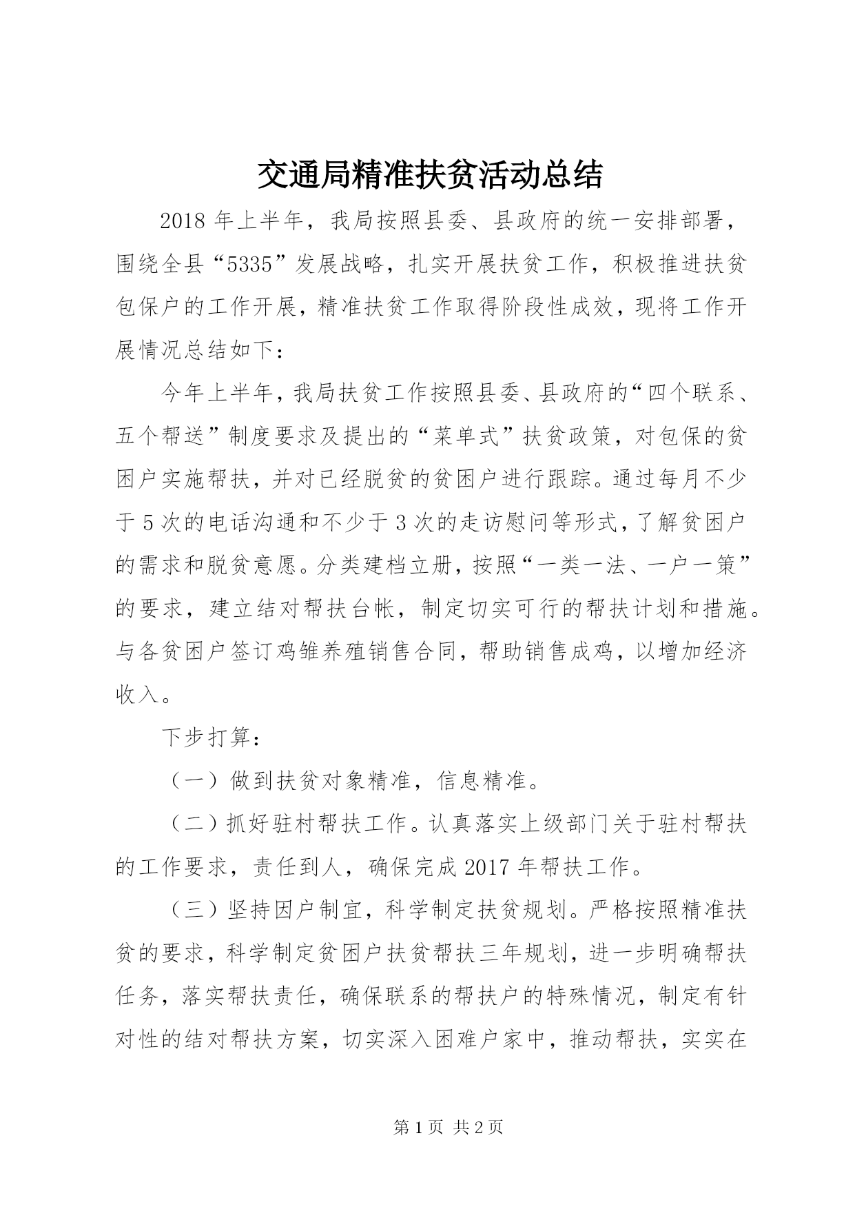 第PAGE\*Arabic\*MERGEFORMAT2页共NUMPAGES\*MERGEFORMAT2页交通局精准扶贫活动总结2018年上半年,我局按照县委、县政府的统一安排部署,围绕全县“5335”发展战略,扎实开展扶贫工作,积极推进扶贫包保户的工作开展,精准扶贫工作取得阶段性成效,现将工作开展情况总结如下:今年上半年,我局扶贫工作按照县委、县政府的“四个联系、五个帮送”制度要求及提出的“菜单式”扶贫政策,对包保的贫困户实施帮扶,并对已经脱贫的贫困户进行跟踪。通过每月不少于5次的电话沟通和不