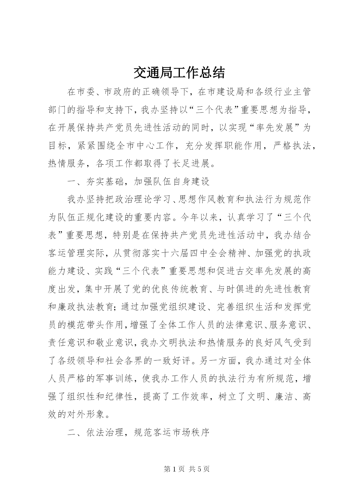 第PAGE\*Arabic\*MERGEFORMAT5页共NUMPAGES\*MERGEFORMAT5页交通局工作总结在市委、市政府的正确领导下,在市建设局和各级行业主管部门的指导和支持下,我办坚持以“三个代表”重要思想为指导,在开展保持共产党员先进性活动的同时,以实现“率先发展”为目标,紧紧围绕全市中心工作,充分发挥职能作用,严格执法,热情服务,各项工作都取得了长足进展。一、夯实基础,加强队伍自身建设我办坚持把政治理论学习、思想作风教育和执法行为规范作为队伍正规化建设的重要内容。今年以来,认