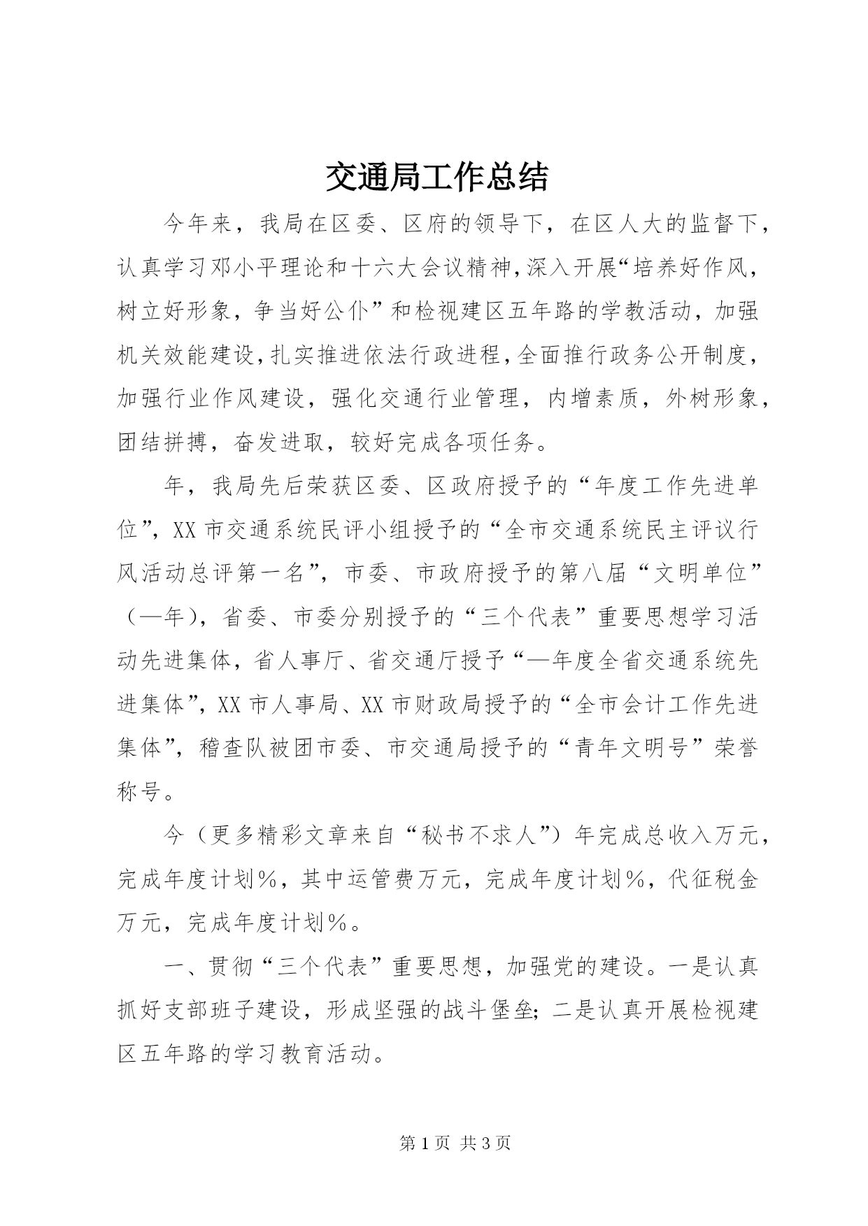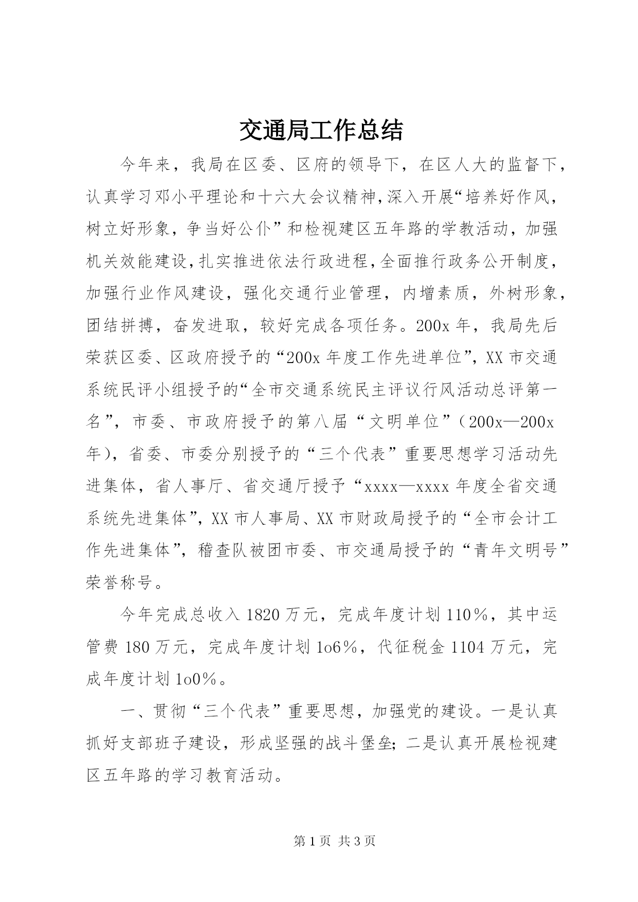 第PAGE\*Arabic\*MERGEFORMAT3页共NUMPAGES\*MERGEFORMAT3页交通局工作总结今年来,我局在区委、区府的领导下,在区人大的监督下,认真学习邓小平理论和十六大会议精神,深入开展“培养好作风,树立好形象,争当好公仆”和检视建区五年路的学教活动,加强机关效能建设,扎实推进依法行政进程,全面推行政务公开制度,加强行业作风建设,强化交通行业管理,内增素质,外树形象,团结拼搏,奋发进取,较好完成各项任务。年,我局先后荣获区委、区政府授予的“年度工作先进单位”,XX市