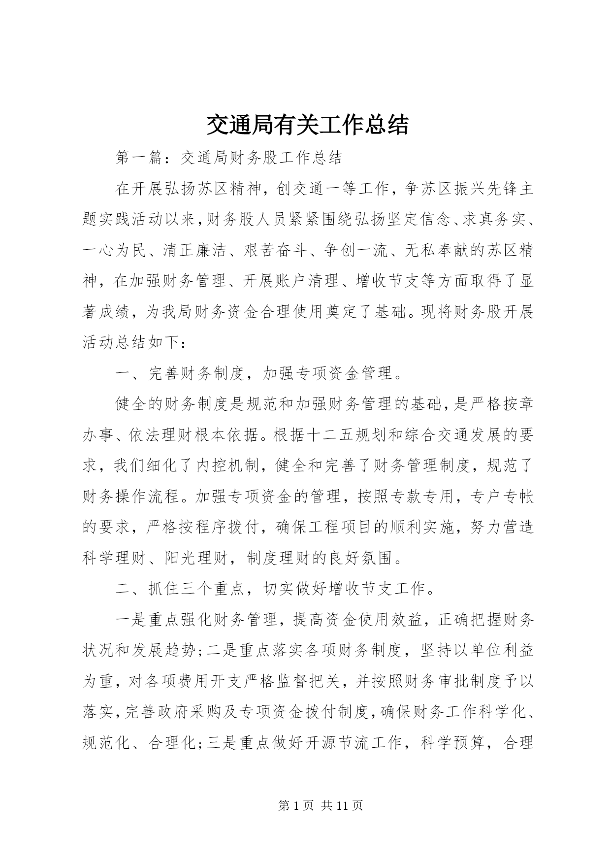 第PAGE\*Arabic\*MERGEFORMAT11页共NUMPAGES\*MERGEFORMAT11页交通局有关工作总结第一篇:交通局财务股工作总结在开展弘扬苏区精神,创交通一等工作,争苏区振兴先锋主题实践活动以来,财务股人员紧紧围绕弘扬坚定信念、求真务实、一心为民、清正廉洁、艰苦奋斗、争创一流、无私奉献的苏区精神,在加强财务管理、开展账户清理、增收节支等方面取得了显著成绩,为我局财务资金合理使用奠定了基础。现将财务股开展活动总结如下:一、完善财务制度,加强专项资金管理。健全的财务制度是