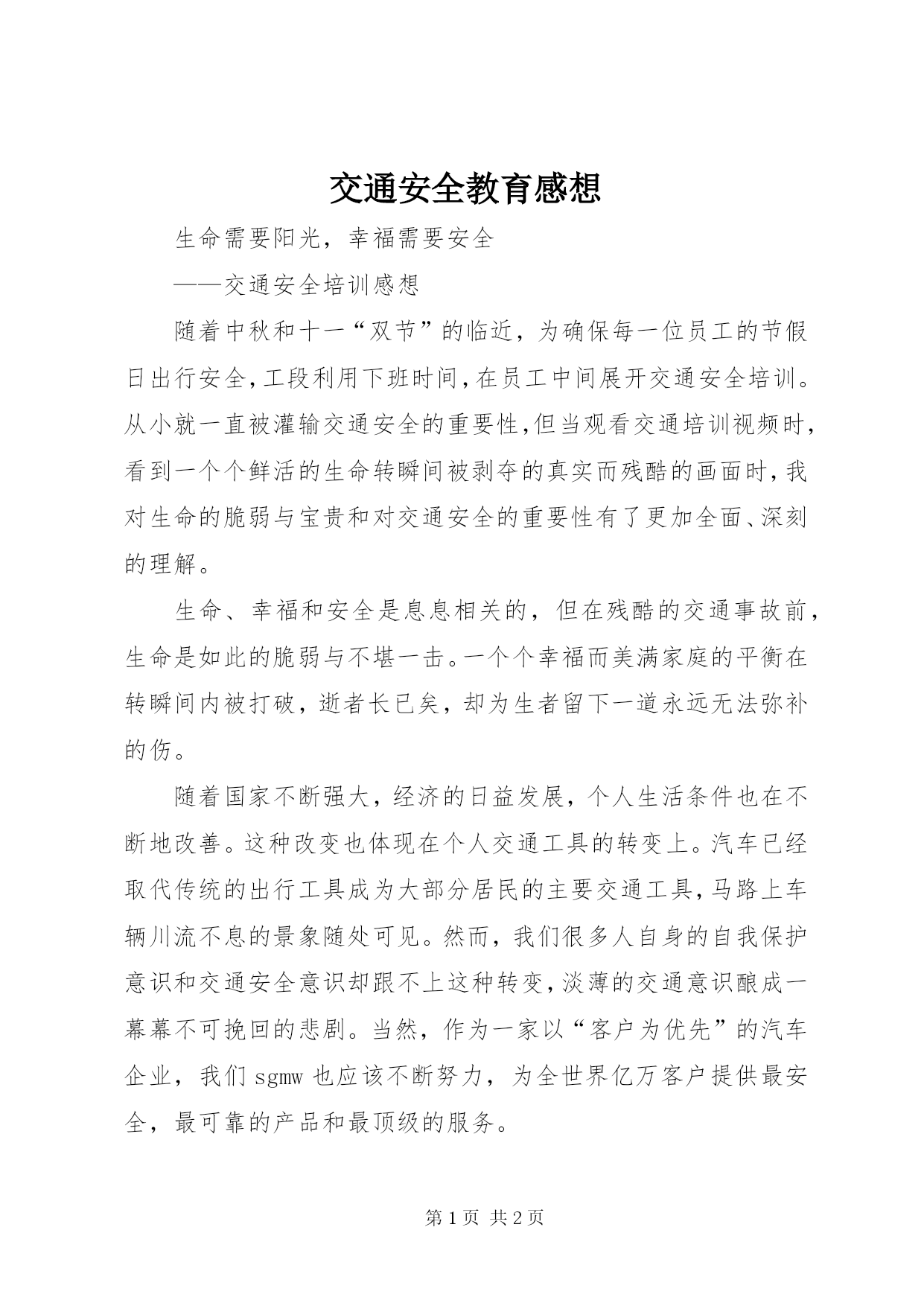 第PAGE\*Arabic\*MERGEFORMAT2页共NUMPAGES\*MERGEFORMAT2页交通安全教育感想生命需要阳光,幸福需要安全——交通安全培训感想随着中秋和十一“双节”的临近,为确保每一位员工的节假日出行安全,工段利用下班时间,在员工中间展开交通安全培训。从小就一直被灌输交通安全的重要性,但当观看交通培训视频时,看到一个个鲜活的生命转瞬间被剥夺的真实而残酷的画面时,我对生命的脆弱与宝贵和对交通安全的重要性有了更加全面、深刻的理解。生命、幸福和安全是息息相关的,但在残酷的交通