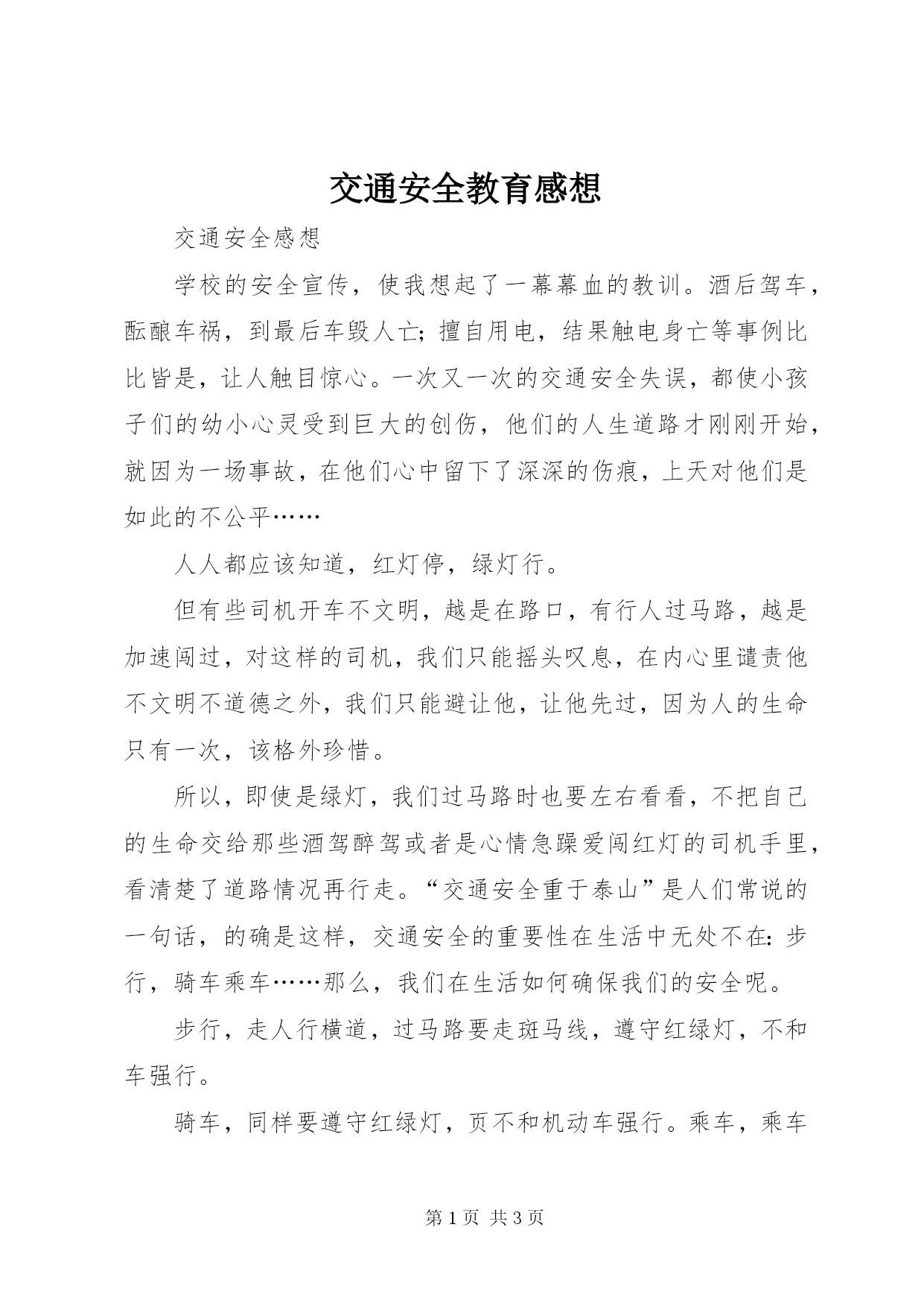 第PAGE\*Arabic\*MERGEFORMAT3页共NUMPAGES\*MERGEFORMAT3页交通安全教育感想交通安全感想学校的安全宣传,使我想起了一幕幕血的教训。酒后驾车,酝酿车祸,到最后车毁人亡;擅自用电,结果触电身亡等事例比比皆是,让人触目惊心。一次又一次的交通安全失误,都使小孩子们的幼小心灵受到巨大的创伤,他们的人生道路才刚刚开始,就因为一场事故,在他们心中留下了深深的伤痕,上天对他们是如此的不公平……人人都应该知道,红灯停,绿灯行。但有些司机开车不文明,越是在路口,有行人过
