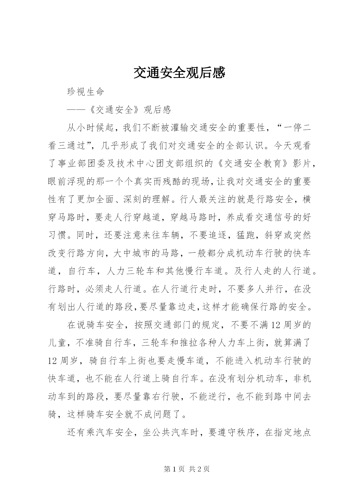第PAGE\*Arabic\*MERGEFORMAT2页共NUMPAGES\*MERGEFORMAT2页交通安全观后感珍视生命——《交通安全》观后感从小时候起,我们不断被灌输交通安全的重要性,“一停二看三通过”,几乎形成了我们对交通安全的全部认识。今天观看了事业部团委及技术中心团支部组织的《交通安全教育》影片,眼前浮现的那一个个真实而残酷的现场,让我对交通安全的重要性有了更加全面、深刻的理解。行人最关注的就是行路安全,横穿马路时,要走人行穿越道,穿越马路时,养成看交通信号的好习惯。同时,还要注
