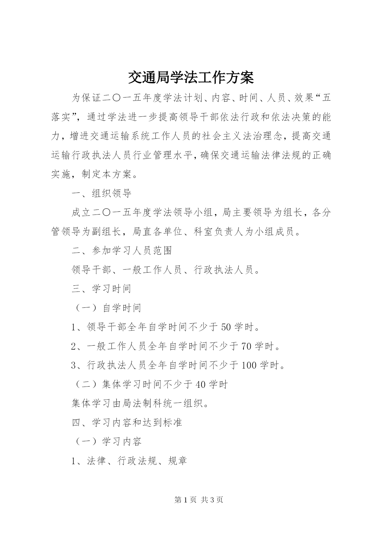 第PAGE\*Arabic\*MERGEFORMAT3页共NUMPAGES\*MERGEFORMAT3页交通局学法工作方案为保证二○一五年度学法计划、内容、时间、人员、效果“五落实”,通过学法进一步提高领导干部依法行政和依法决策的能力,增进交通运输系统工作人员的社会主义法治理念,提高交通运输行政执法人员行业管理水平,确保交通运输法律法规的正确实施,制定本方案。一、组织领导成立二○一五年度学法领导小组,局主要领导为组长,各分管领导为副组长,局直各单位、科室负责人为小组成员。二、参加学习人员范围领