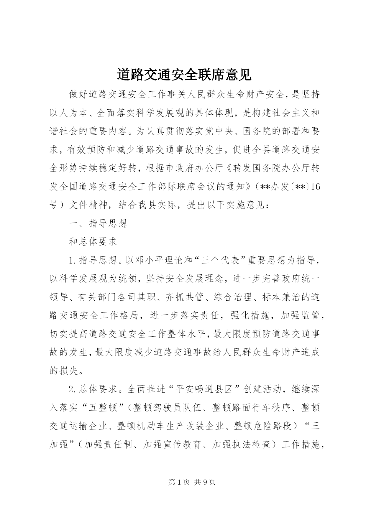 第PAGE\*Arabic\*MERGEFORMAT9页共NUMPAGES\*MERGEFORMAT9页道路交通安全联席意见做好道路交通安全工作事关人民群众生命财产安全,是坚持以人为本、全面落实科学发展观的具体体现,是构建社会主义和谐社会的重要内容。为认真贯彻落实党中央、国务院的部署和要求,有效预防和减少道路交通事故的发生,促进全县道路交通安全形势持续稳定好转,根据市政府办公厅《转发国务院办公厅转发全国道路交通安全工作部际联席会议的通知》(**办发〔**〕16号)文件精神,结合我县实际,提出以