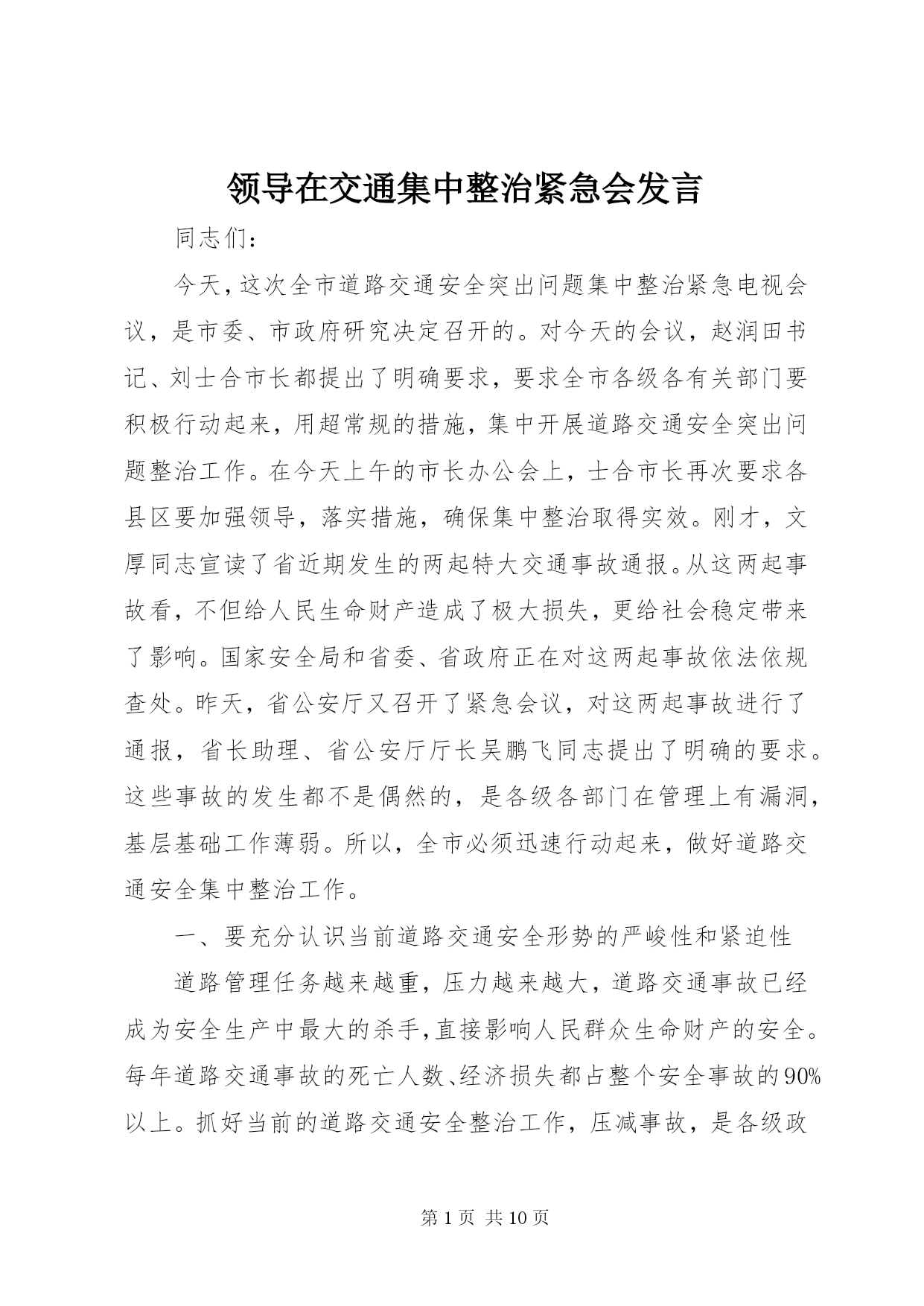 第PAGE\*Arabic\*MERGEFORMAT10页共NUMPAGES\*MERGEFORMAT10页领导在交通集中整治紧急会发言同志们:今天,这次全市道路交通安全突出问题集中整治紧急电视会议,是市委、市政府研究决定召开的。对今天的会议,赵润田书记、刘士合市长都提出了明确要求,要求全市各级各有关部门要积极行动起来,用超常规的措施,集中开展道路交通安全突出问题整治工作。在今天上午的市长办公会上,士合市长再次要求各县区要加强领导,落实措施,确保集中整治取得实效。刚才,文厚同志宣读了省近期发生