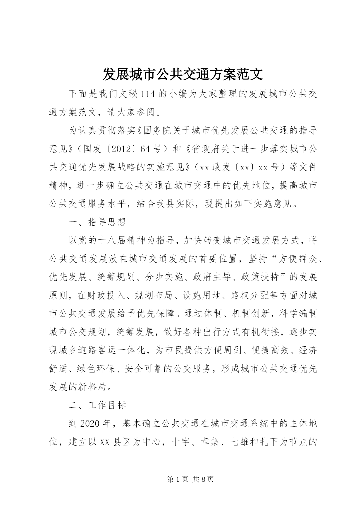 第PAGE\*Arabic\*MERGEFORMAT8页共NUMPAGES\*MERGEFORMAT8页发展城市公共交通方案范文下面是我们文秘114的小编为大家整理的发展城市公共交通方案范文,请大家参阅。为认真贯彻落实《国务院关于城市优先发展公共交通的指导意见》(国发〔2012〕64号)和《省政府关于进一步落实城市公共交通优先发展战略的实施意见》(xx政发〔xx〕xx号)等文件精神,进一步确立公共交通在城市交通中的优先地位,提高城市公共交通服务水平,结合我县实际,现提出如下实施意见。一、指导思