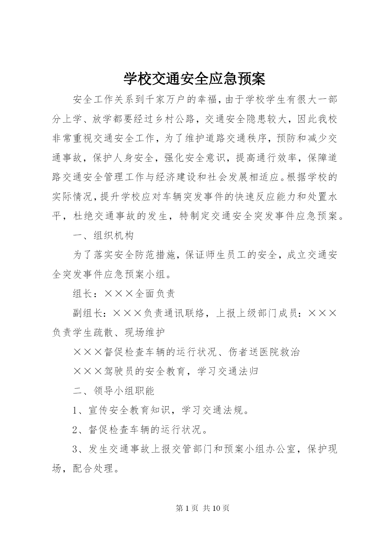 第PAGE\*Arabic\*MERGEFORMAT10页共NUMPAGES\*MERGEFORMAT10页学校交通安全应急预案安全工作关系到千家万户的幸福,由于学校学生有很大一部分上学、放学都要经过乡村公路,交通安全隐患较大,因此我校非常重视交通安全工作,为了维护道路交通秩序,预防和减少交通事故,保护人身安全,强化安全意识,提高通行效率,保障道路交通安全管理工作与经济建设和社会发展相适应。根据学校的实际情况,提升学校应对车辆突发事件的快速反应能力和处置水平,杜绝交通事故的发生,特制定交通安全