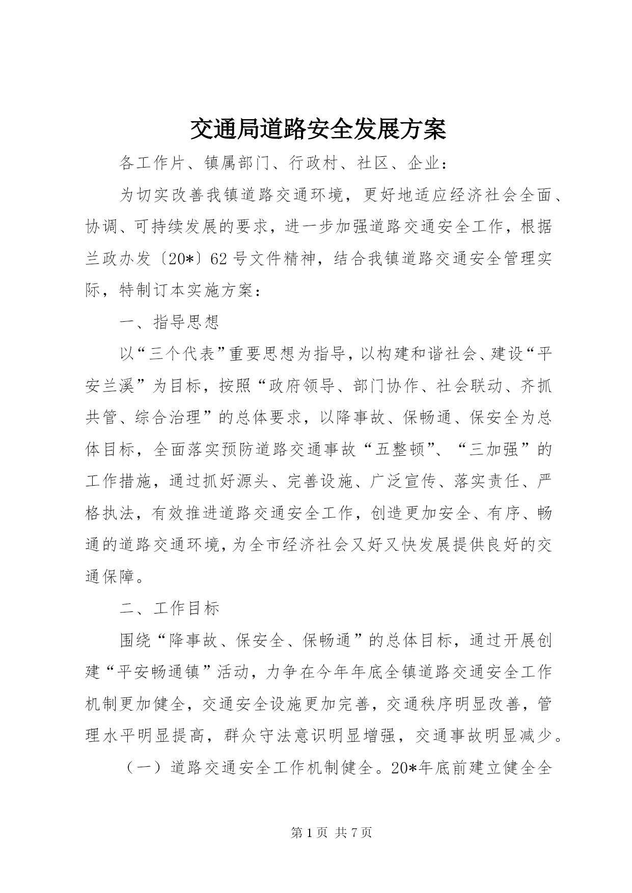 第PAGE\*Arabic\*MERGEFORMAT7页共NUMPAGES\*MERGEFORMAT7页交通局道路安全发展方案各工作片、镇属部门、行政村、社区、企业:为切实改善我镇道路交通环境,更好地适应经济社会全面、协调、可持续发展的要求,进一步加强道路交通安全工作,根据兰政办发〔20*〕62号文件精神,结合我镇道路交通安全管理实际,特制订本实施方案:一、指导思想以“三个代表”重要思想为指导,以构建和谐社会、建设“平安兰溪”为目标,按照“政府领导、部门协作、社会联动、齐抓共管、综合治理”的总
