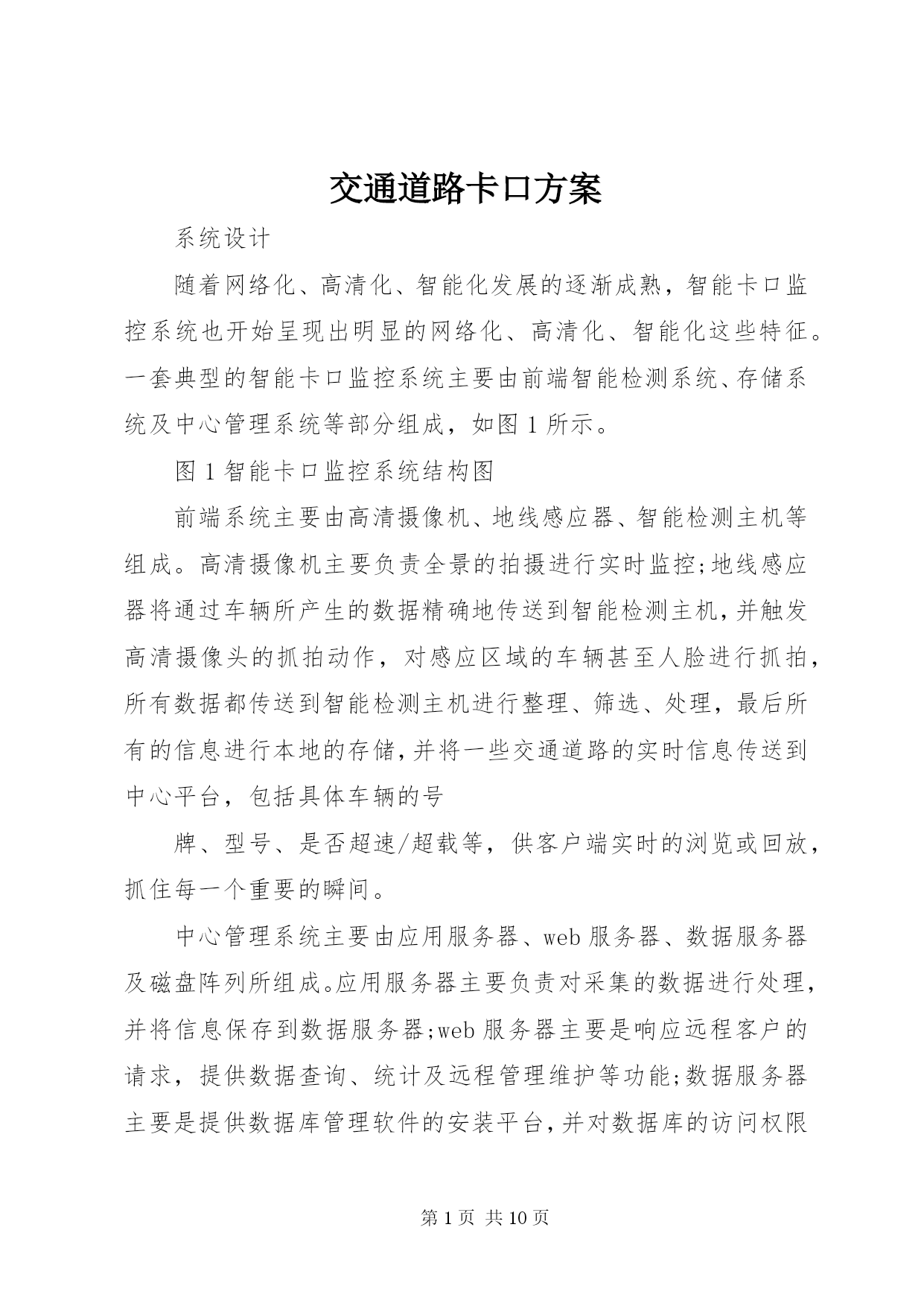 第PAGE\*Arabic\*MERGEFORMAT10页共NUMPAGES\*MERGEFORMAT10页交通道路卡口方案系统设计随着网络化、高清化、智能化发展的逐渐成熟,智能卡口监控系统也开始呈现出明显的网络化、高清化、智能化这些特征。一套典型的智能卡口监控系统主要由前端智能检测系统、存储系统及中心管理系统等部分组成,如图1所示。图1智能卡口监控系统结构图前端系统主要由高清摄像机、地线感应器、智能检测主机等组成。高清摄像机主要负责全景的拍摄进行实时监控;地线感应器将通过车辆所产生的数据精确