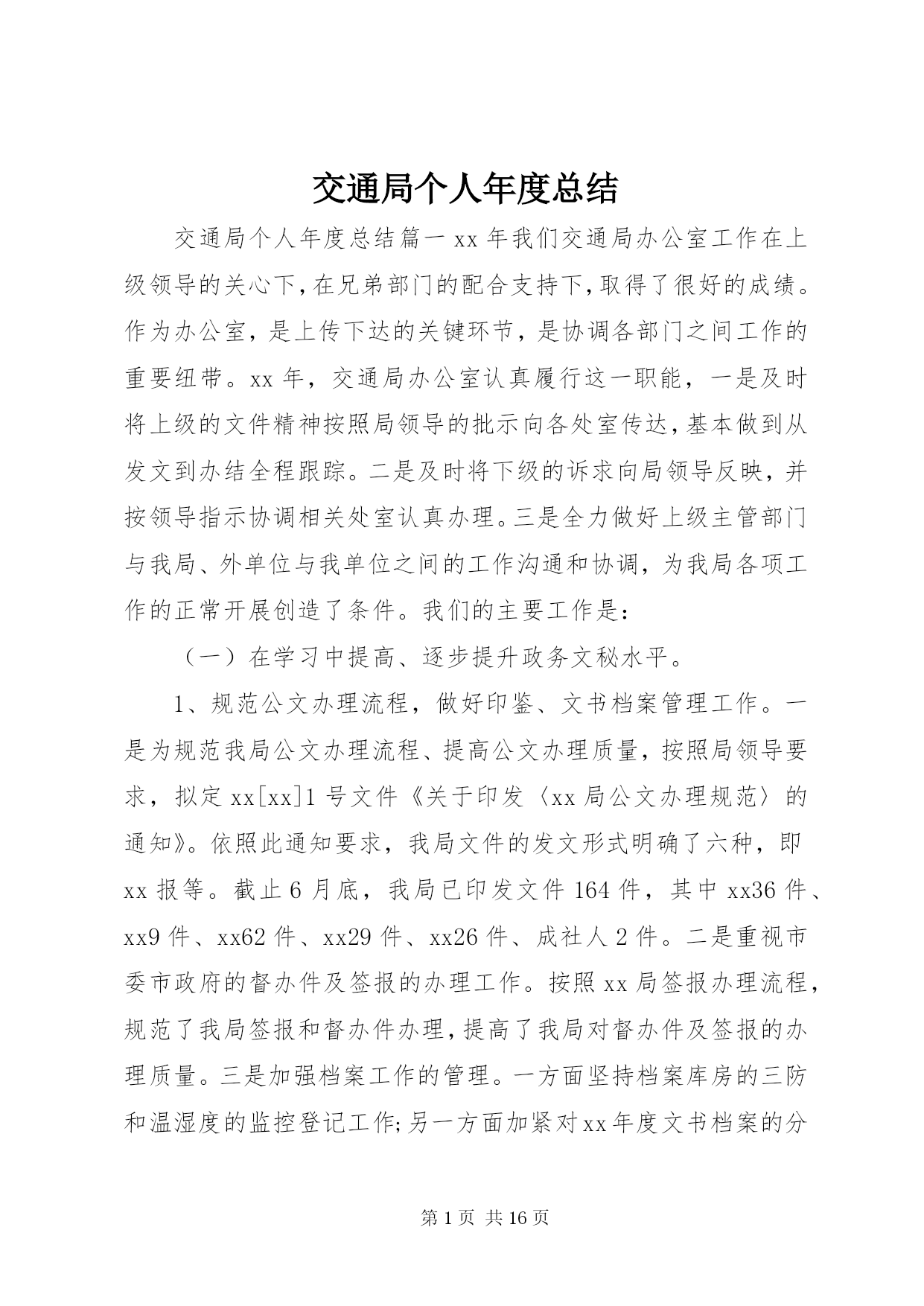 第PAGE\*Arabic\*MERGEFORMAT16页共NUMPAGES\*MERGEFORMAT16页交通局个人年度总结交通局个人年度总结篇一xx年我们交通局办公室工作在上级领导的关心下,在兄弟部门的配合支持下,取得了很好的成绩。作为办公室,是上传下达的关键环节,是协调各部门之间工作的重要纽带。xx年,交通局办公室认真履行这一职能,一是及时将上级的文件精神按照局领导的批示向各处室传达,基本做到从发文到办结全程跟踪。二是及时将下级的诉求向局领导反映,并按领导指示协调相关处室认真办理。三是全