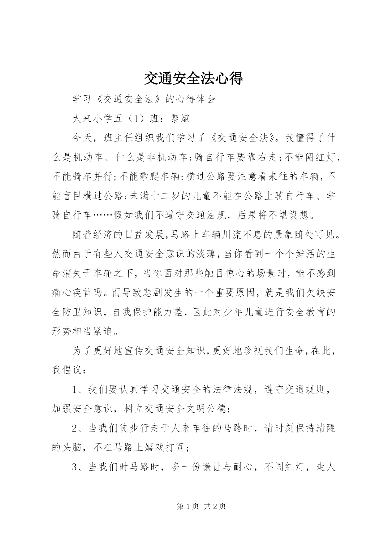 第PAGE\*Arabic\*MERGEFORMAT2页共NUMPAGES\*MERGEFORMAT2页交通安全法心得学习《交通安全法》的心得体会太来小学五(1)班:黎斌今天,班主任组织我们学习了《交通安全法》。我懂得了什么是机动车、什么是非机动车;骑自行车要靠右走;不能闯红灯,不能骑车并行;不能攀爬车辆;横过公路要注意看来往的车辆,不能盲目横过公路;未满十二岁的儿童不能在公路上骑自行车、学骑自行车……假如我们不遵守交通法规,后果将不堪设想。随着经济的日益发展,马路上车辆川流不息的景象随处可见