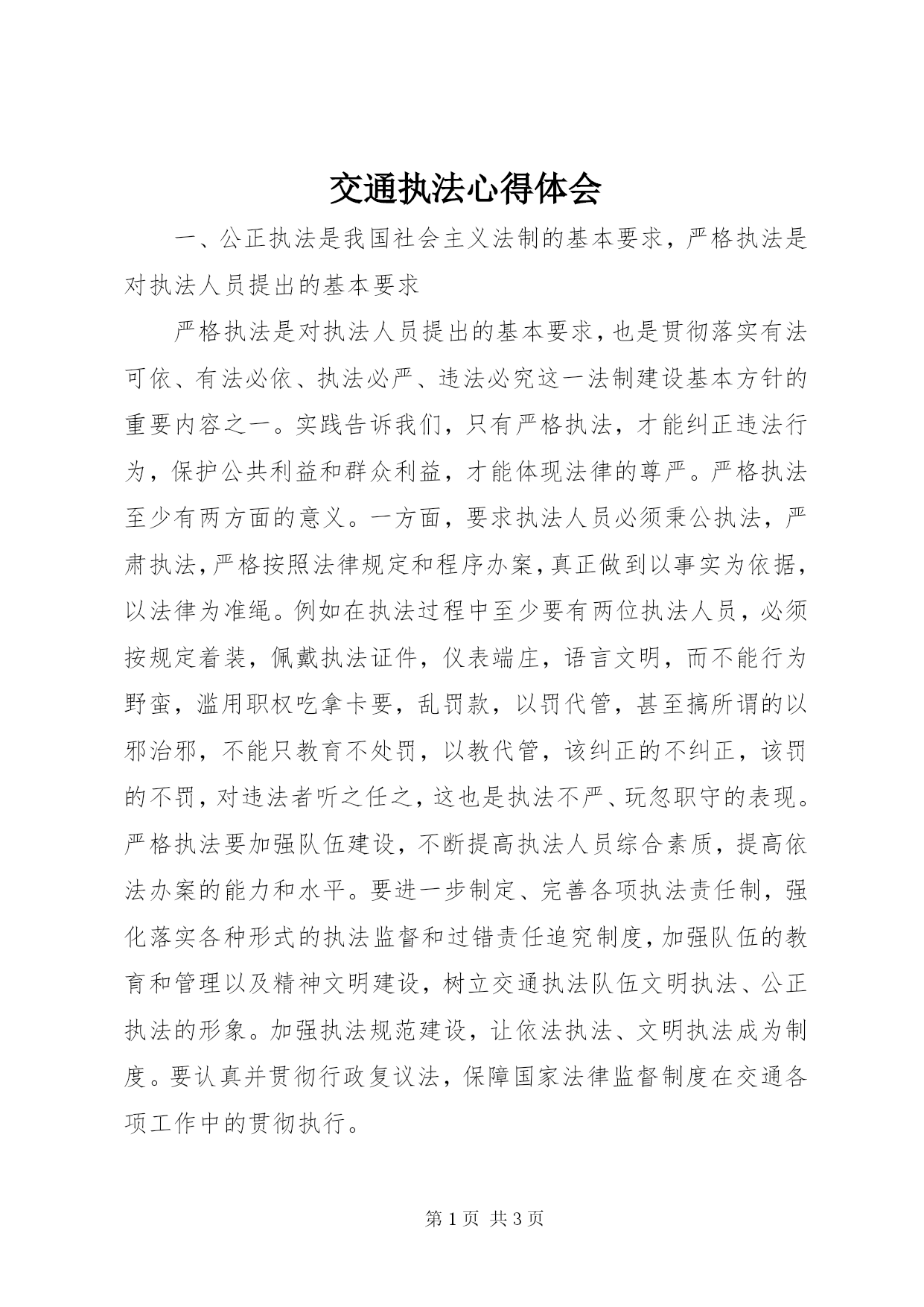第PAGE\*Arabic\*MERGEFORMAT3页共NUMPAGES\*MERGEFORMAT3页交通执法心得体会一、公正执法是我国社会主义法制的基本要求,严格执法是对执法人员提出的基本要求严格执法是对执法人员提出的基本要求,也是贯彻落实有法可依、有法必依、执法必严、违法必究这一法制建设基本方针的重要内容之一。实践告诉我们,只有严格执法,才能纠正违法行为,保护公共利益和群众利益,才能体现法律的尊严。严格执法至少有两方面的意义。一方面,要求执法人员必须秉公执法,严肃执法,严格按照法律规定和