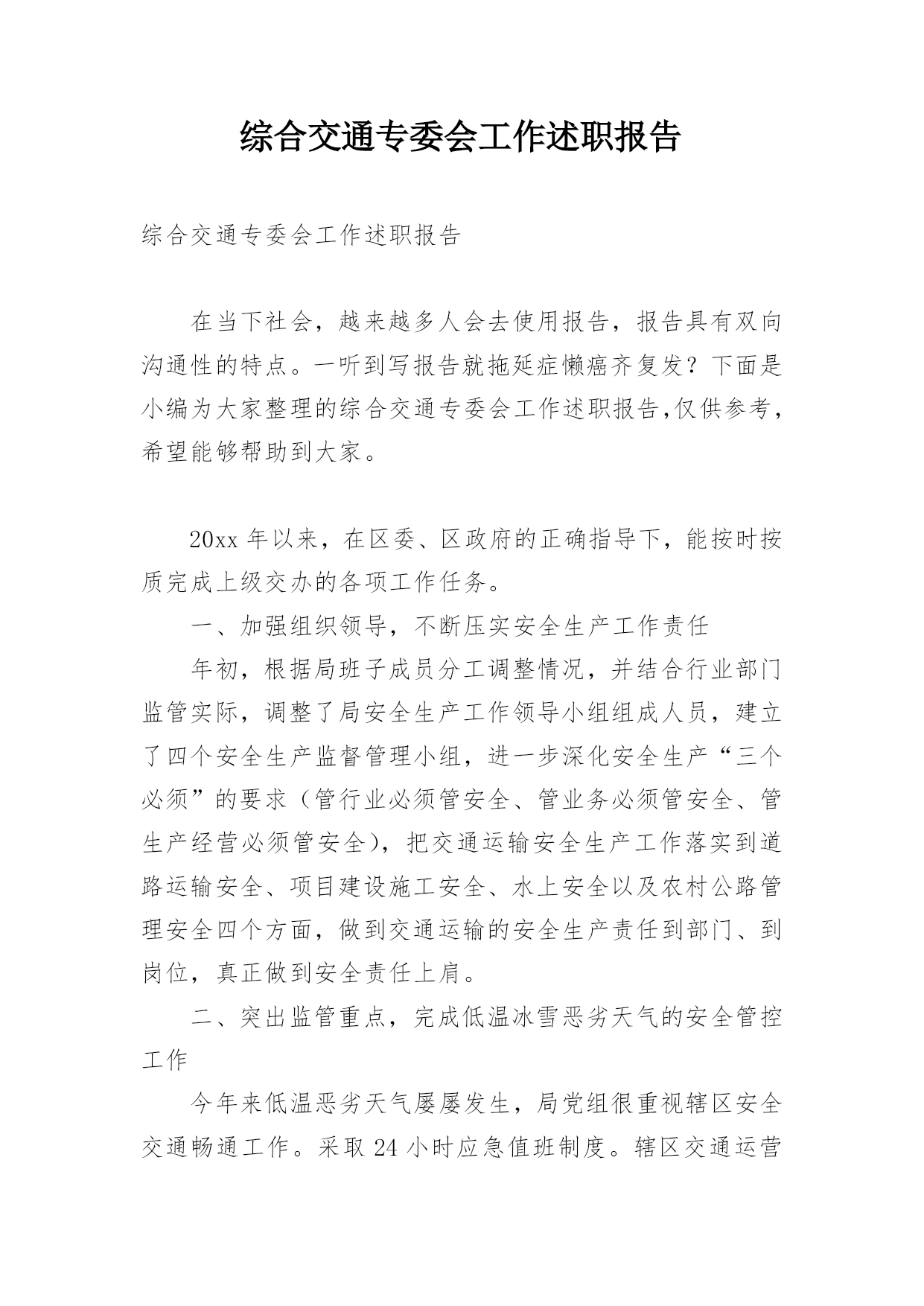 综合交通专委会工作述职报告综合交通专委会工作述职报告在当下社会,越来越多人会去使用报告,报告具有双向沟通性的特点。一听到写报告就拖延症懒癌齐复发?下面是小编为大家整理的综合交通专委会工作述职报告,仅供参考,希望能够帮助到大家。20xx年以来,在区委、区政府的正确指导下,能按时按质完成上级交办的各项工作任务。一、加强组织领导,不断压实安全生产工作责任年初,根据局班子成员分工调整情况,并结合行业部门监管实际,调整了局安全生产工作领导小组组成人员,建立了四个安全生产监督管理小组,进一步深化安全生产“三个必须”的