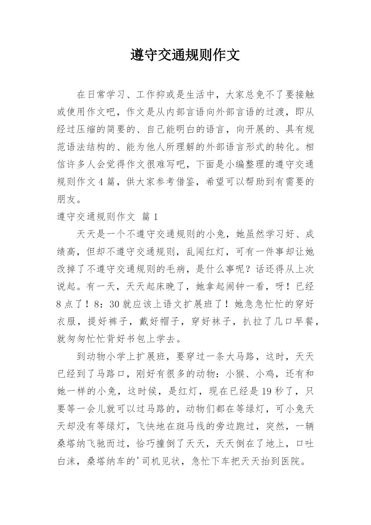 遵守交通规则作文在日常学习、工作抑或是生活中,大家总免不了要接触或使用作文吧,作文是从内部言语向外部言语的过渡,即从经过压缩的简要的、自己能明白的语言,向开展的、具有规范语法结构的、能为他人所理解的外部语言形式的转化。相信许多人会觉得作文很难写吧,下面是小编整理的遵守交通规则作文4篇,供大家参考借鉴,希望可以帮助到有需要的朋友。遵守交通规则作文篇1天天是一个不遵守交通规则的小兔,她虽然学习好、成绩高,但却不遵守交通规则,乱闯红灯,可有一件事却让她改掉了不遵守交通规则的毛病,是什么事呢?话还得从上次说起。有
